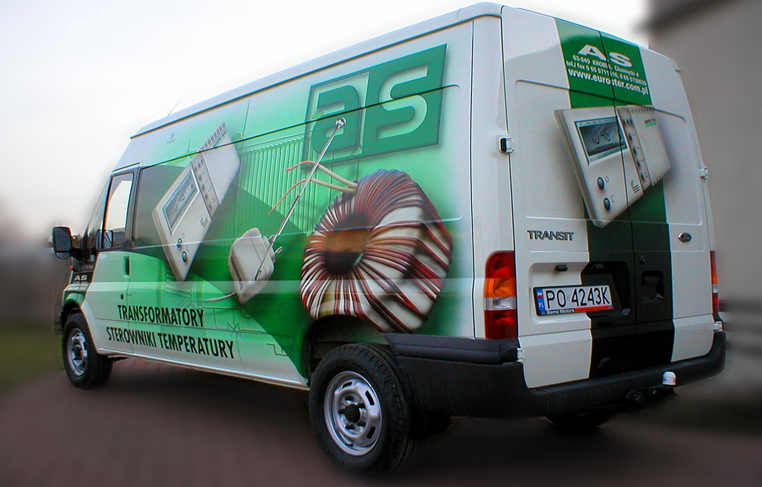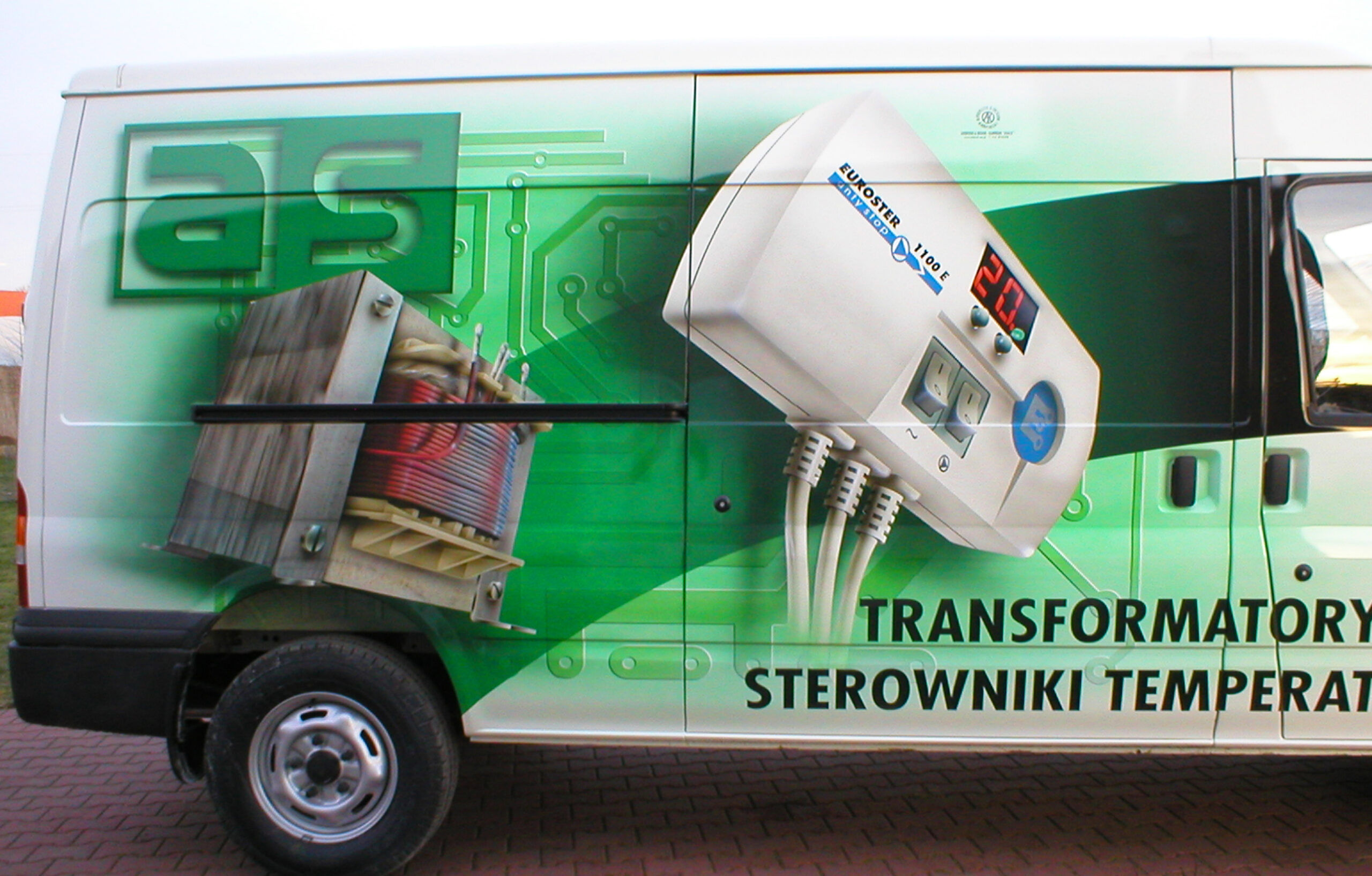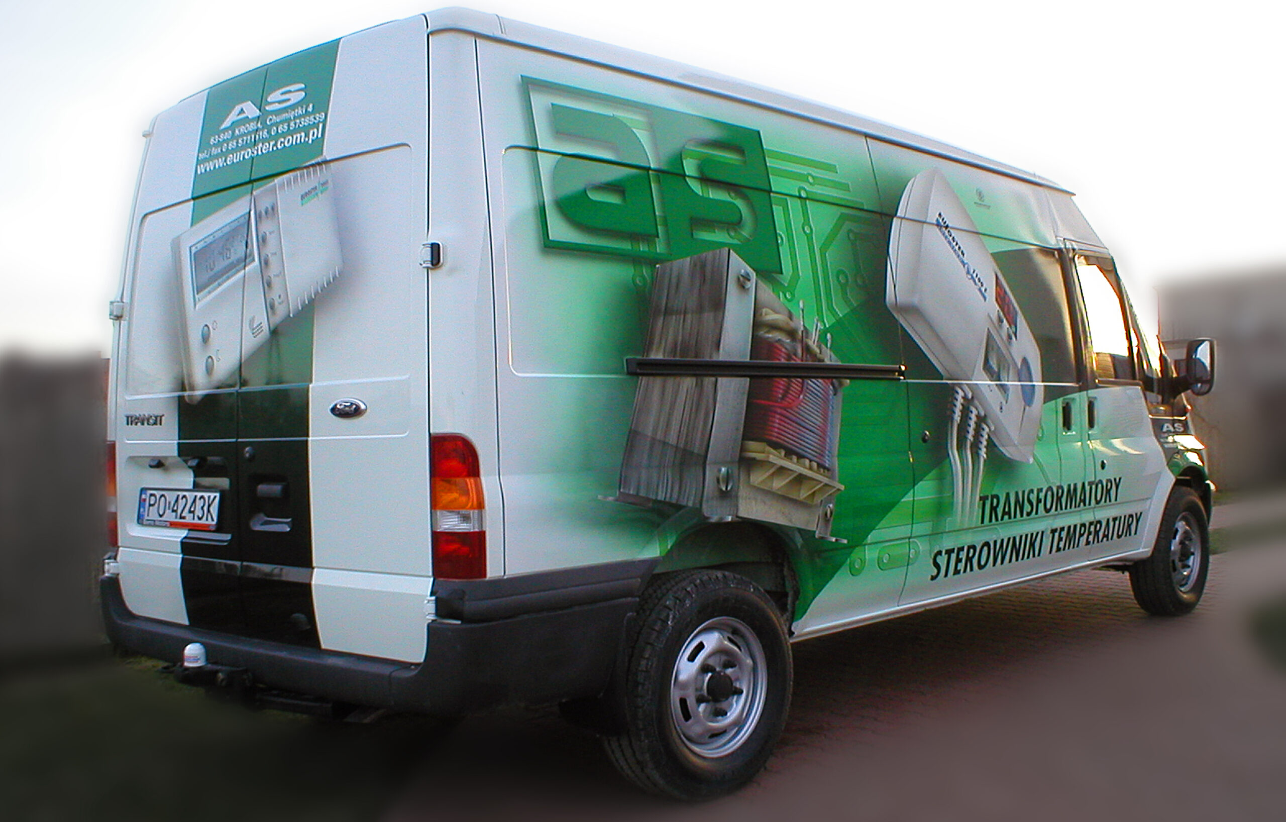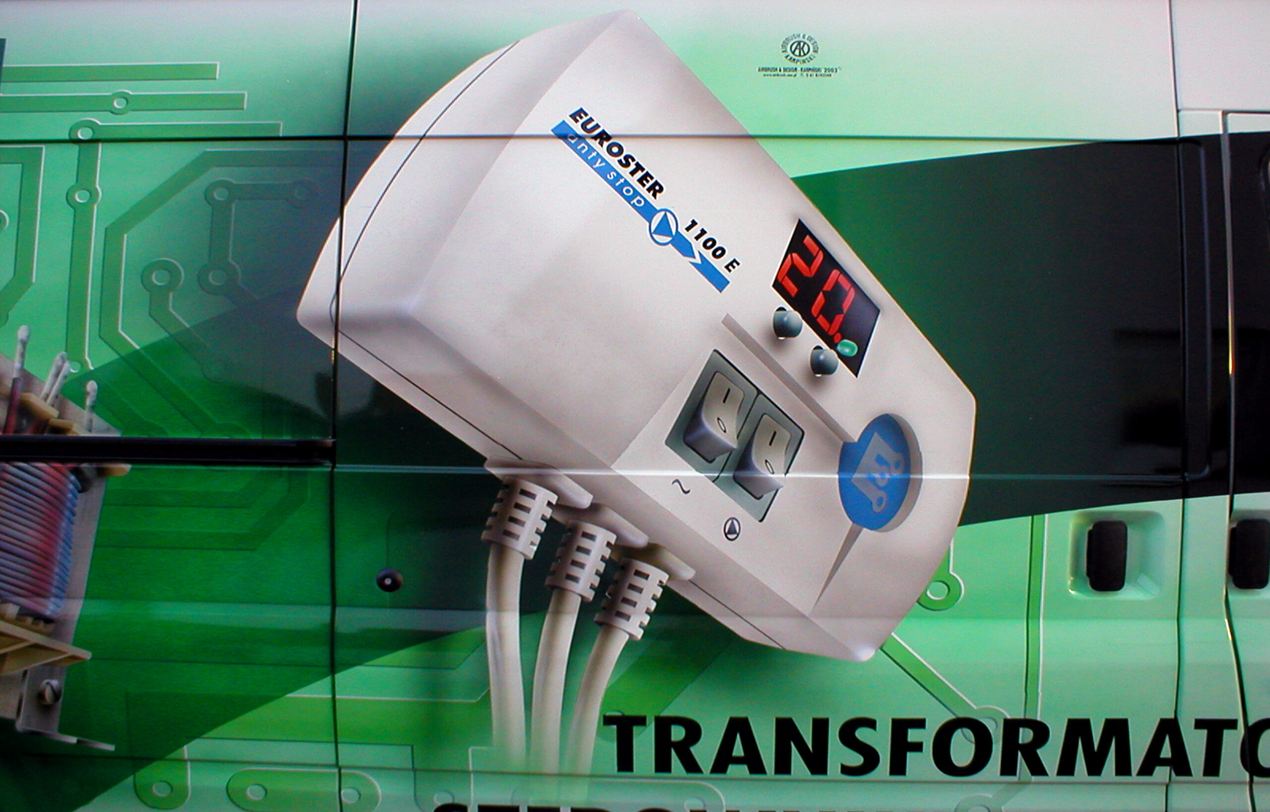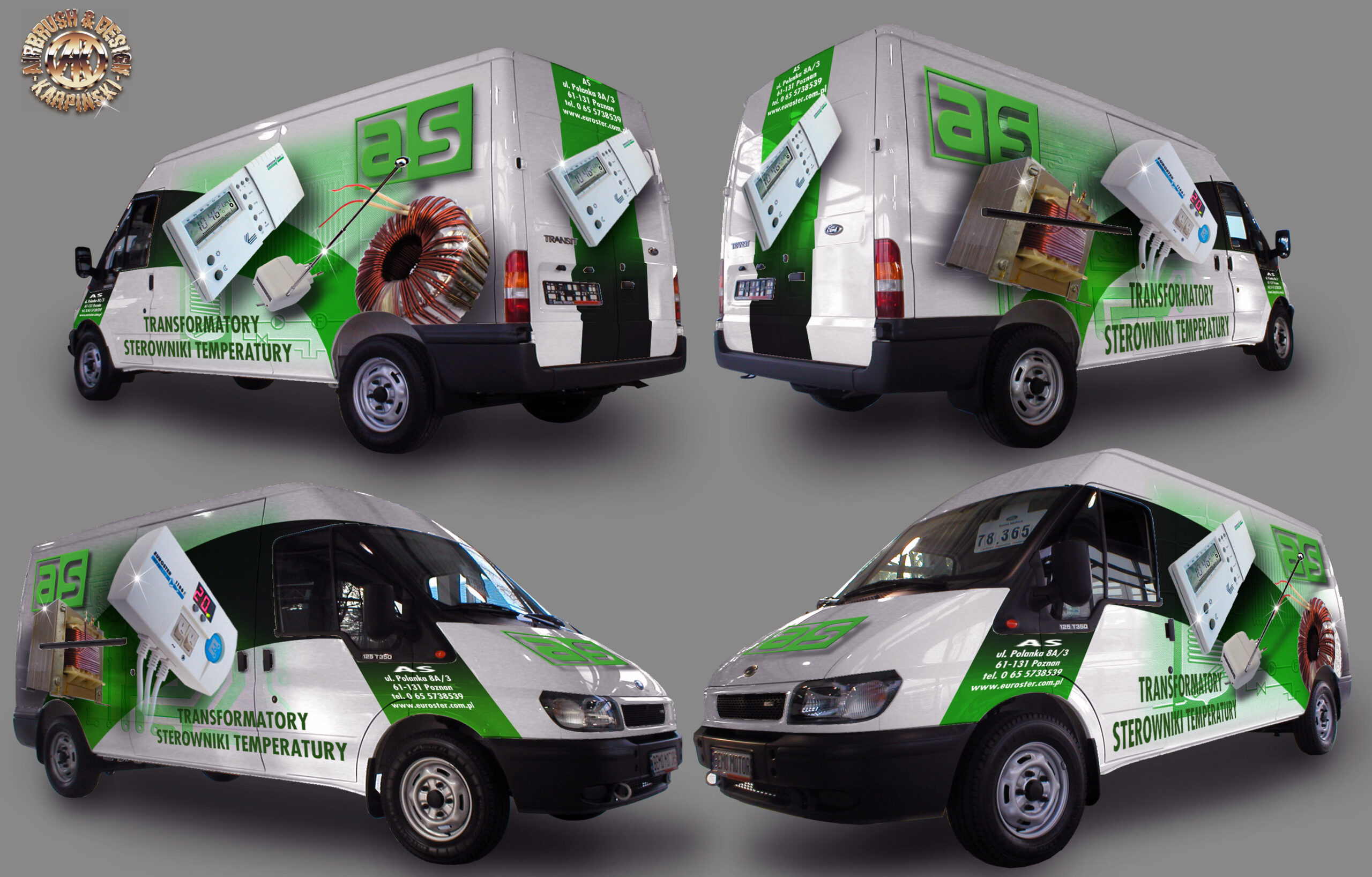 Przedstawiam dzisiaj reklamę transformatorów i elektroniki grzewczej wykonaną na samochodzie dostawczym producenta. Cała praca została wykonana w technice Airbrush. Pracę rozpocząłem od projektu. Celem było połączenie elementów graficznych z linią pojazdu, szczególnie z oknami kierowcy i pasażera. Odszedłem od schematu umieszczenia danych adresowych na drzwiach. Głównym elementem konstrukcyjnym kompozycji miał być szeroki, cieniowany w tonacjach zieleni pas, prowadzony od tylnych nadkoli łukiem, omijający okna, aż do nadkoli przednich. Pas ten miał być cieniowany od czerni przy uszczelkach okien kabiny kierowcy, aż do jasnej zieleni przy nadkolach. W celu nadania reklamie elektronicznego charakteru, postanowiłem umieścić na dwóch bokach tło, w postaci drukowanych płytek elektronicznych w dużym powiększeniu. Samochód nabrał głębokiej, zielonej tonacji. Na jej tle bardzo silnie kontrastowały białe sterowniki ogrzewania i miedziane zwoje kondensatorów. Produkty oraz logo firmowe rozmieściłem w oparciu o szeroki pas zieleni, zachowując zasadę równowagi optycznej.