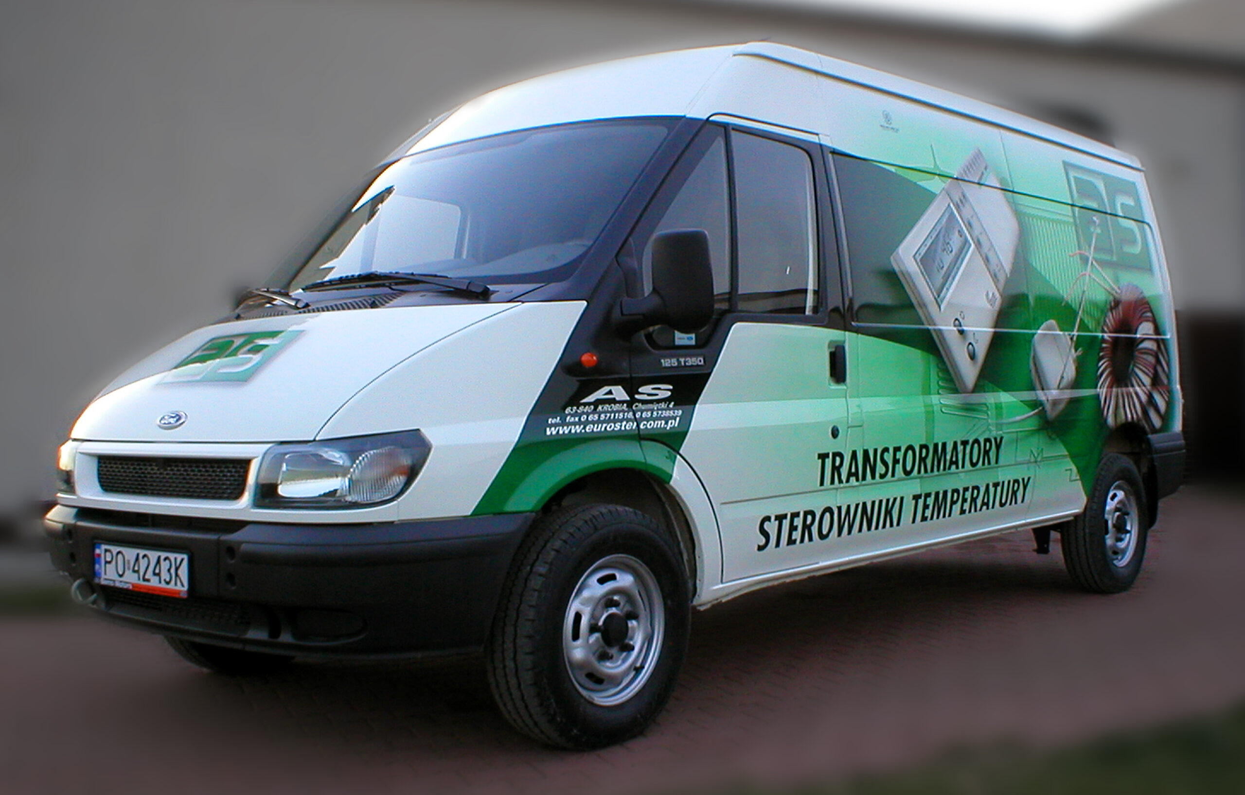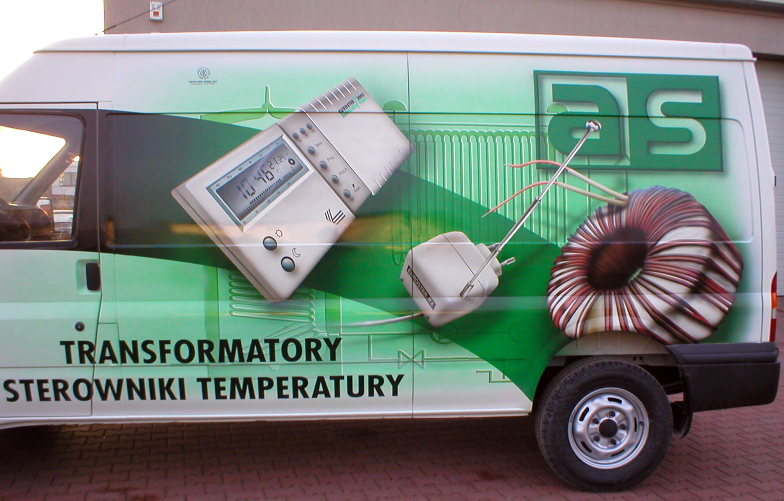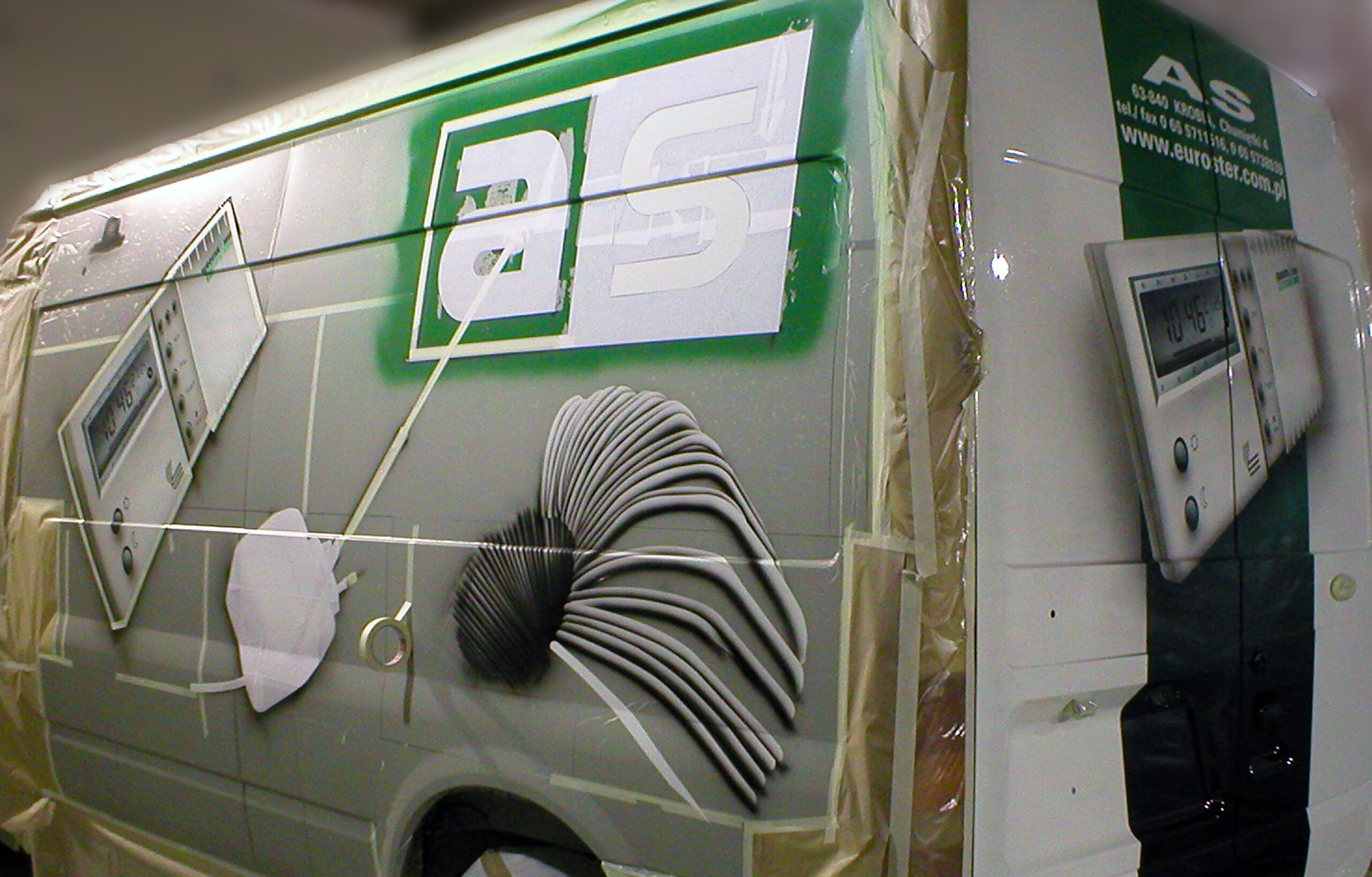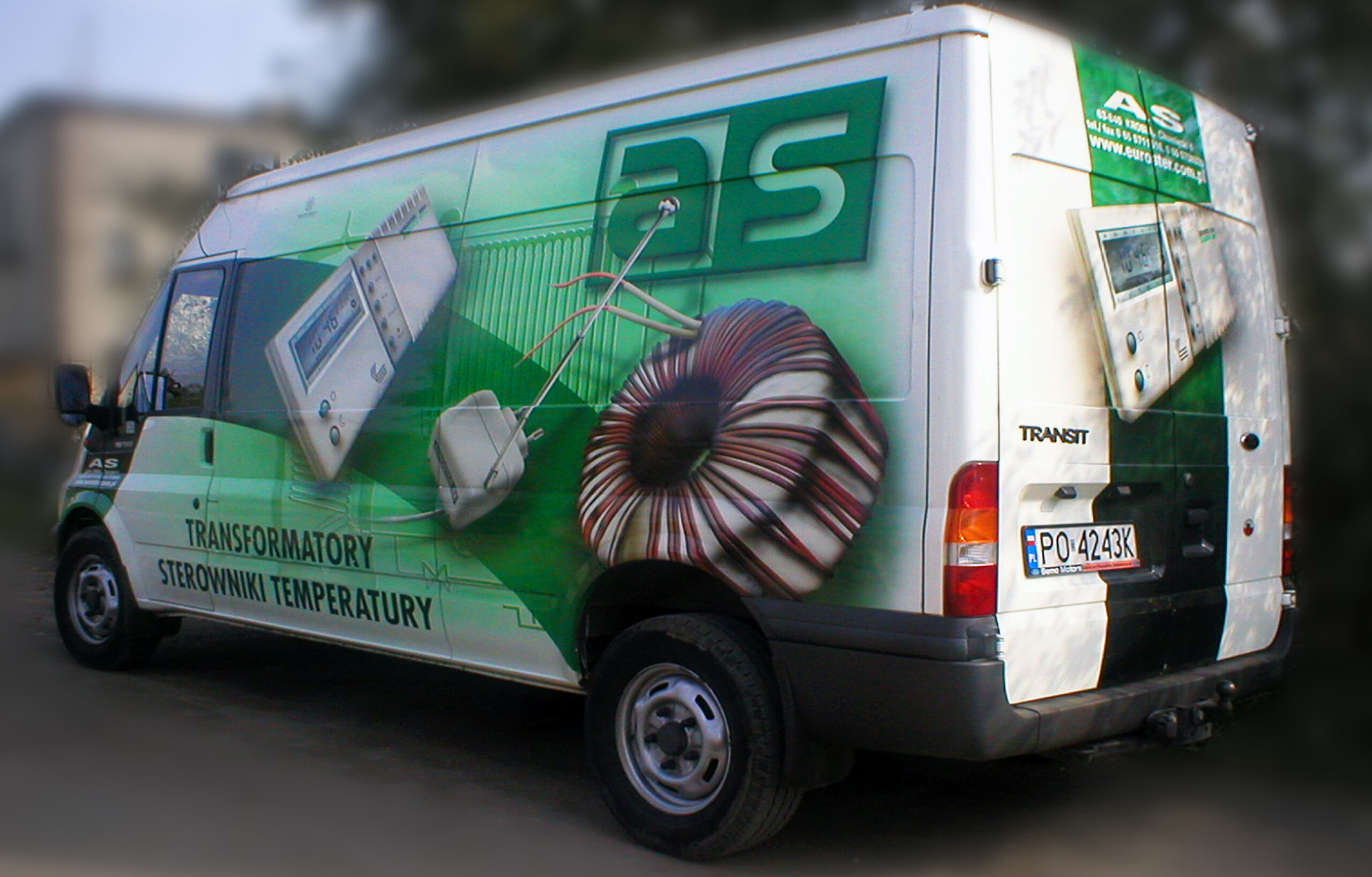 Przedstawiam dzisiaj reklamę transformatorów i elektroniki grzewczej wykonaną na samochodzie dostawczym producenta. Cała praca została wykonana w technice Airbrush. Pracę rozpocząłem od projektu. Celem było połączenie elementów graficznych z linią pojazdu, szczególnie z oknami kierowcy i pasażera. Odszedłem od schematu umieszczenia danych adresowych na drzwiach. Głównym elementem konstrukcyjnym kompozycji miał być szeroki, cieniowany w tonacjach zieleni pas, prowadzony od tylnych nadkoli łukiem, omijający okna, aż do nadkoli przednich. Pas ten miał być cieniowany od czerni przy uszczelkach okien kabiny kierowcy, aż do jasnej zieleni przy nadkolach. W celu nadania reklamie elektronicznego charakteru, postanowiłem umieścić na dwóch bokach tło, w postaci drukowanych płytek elektronicznych w dużym powiększeniu. Samochód nabrał głębokiej, zielonej tonacji. Na jej tle bardzo silnie kontrastowały białe sterowniki ogrzewania i miedziane zwoje kondensatorów. Produkty oraz logo firmowe rozmieściłem w oparciu o szeroki pas zieleni, zachowując zasadę równowagi optycznej.