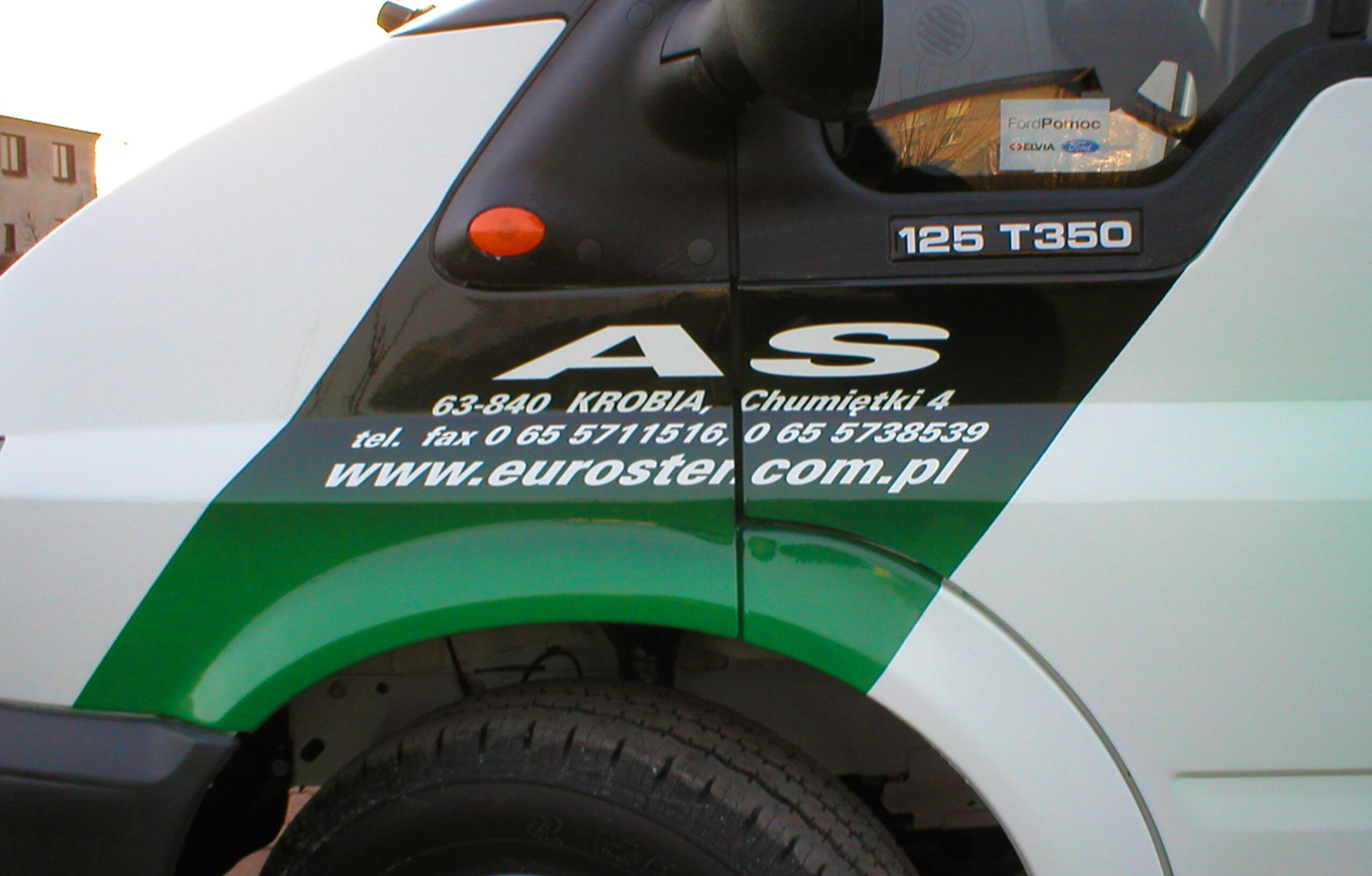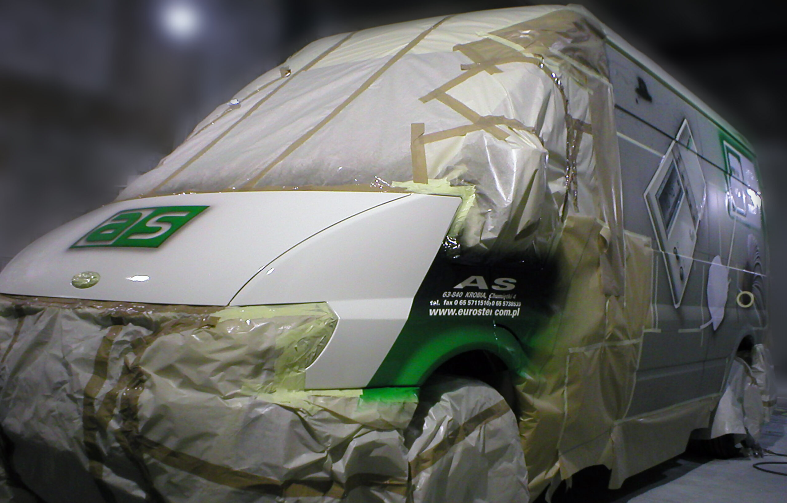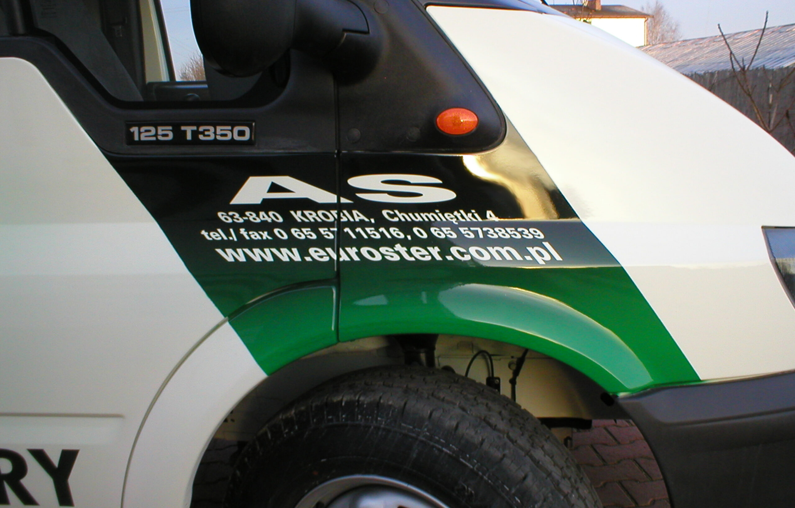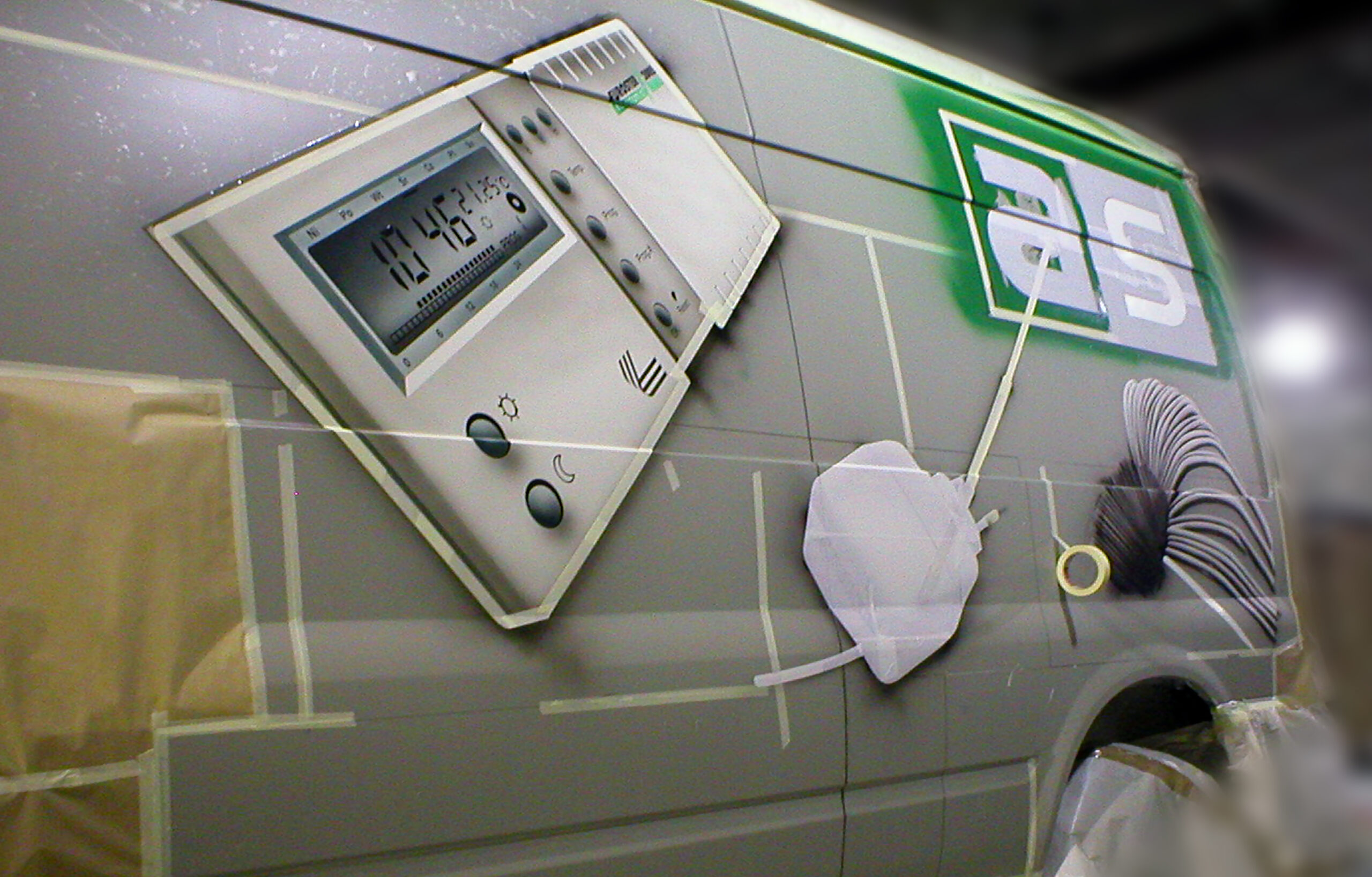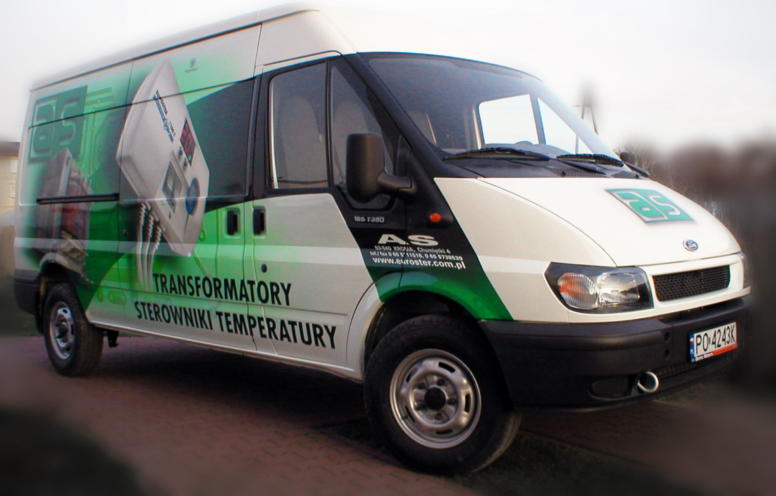 Przedstawiam dzisiaj reklamę transformatorów i elektroniki grzewczej wykonaną na samochodzie dostawczym producenta. Cała praca została wykonana w technice Airbrush. Pracę rozpocząłem od projektu. Celem było połączenie elementów graficznych z linią pojazdu, szczególnie z oknami kierowcy i pasażera. Odszedłem od schematu umieszczenia danych adresowych na drzwiach. Głównym elementem konstrukcyjnym kompozycji miał być szeroki, cieniowany w tonacjach zieleni pas, prowadzony od tylnych nadkoli łukiem, omijający okna, aż do nadkoli przednich. Pas ten miał być cieniowany od czerni przy uszczelkach okien kabiny kierowcy, aż do jasnej zieleni przy nadkolach. W celu nadania reklamie elektronicznego charakteru, postanowiłem umieścić na dwóch bokach tło, w postaci drukowanych płytek elektronicznych w dużym powiększeniu. Samochód nabrał głębokiej, zielonej tonacji. Na jej tle bardzo silnie kontrastowały białe sterowniki ogrzewania i miedziane zwoje kondensatorów. Produkty oraz logo firmowe rozmieściłem w oparciu o szeroki pas zieleni, zachowując zasadę równowagi optycznej.