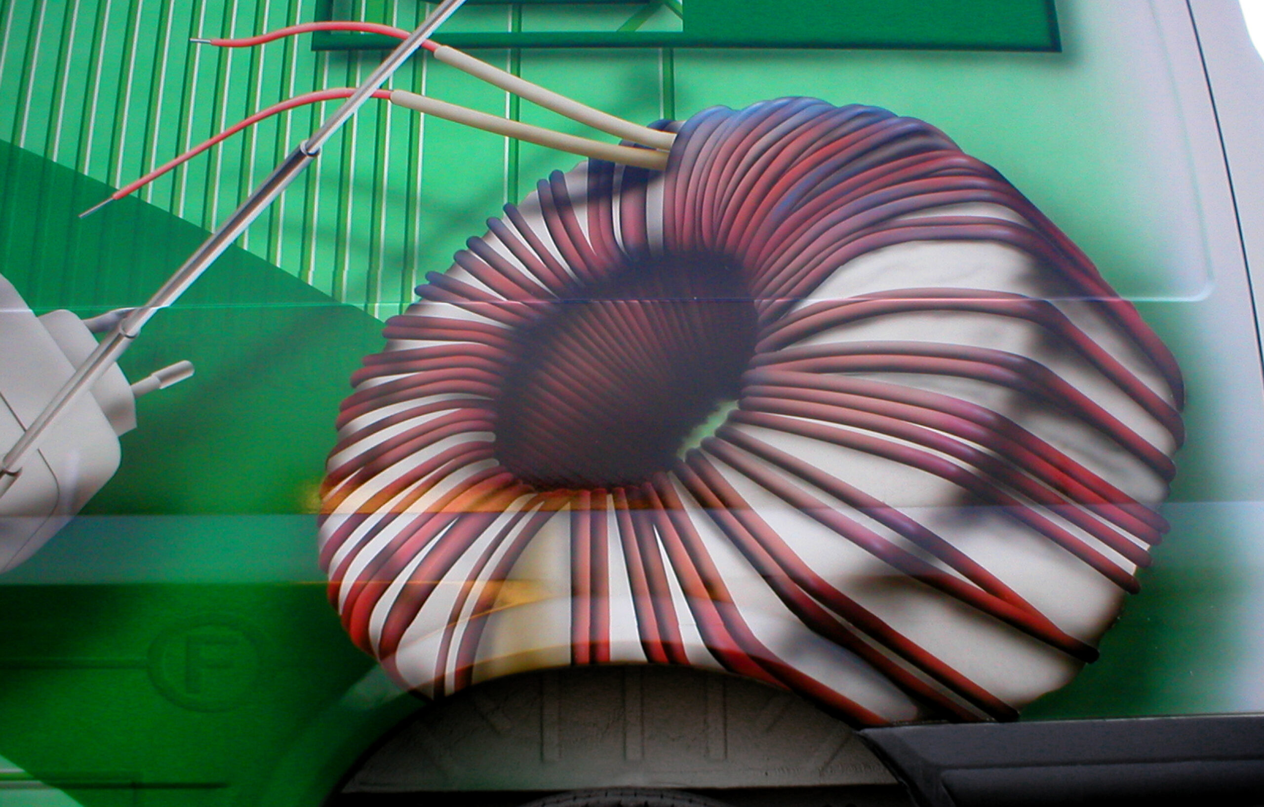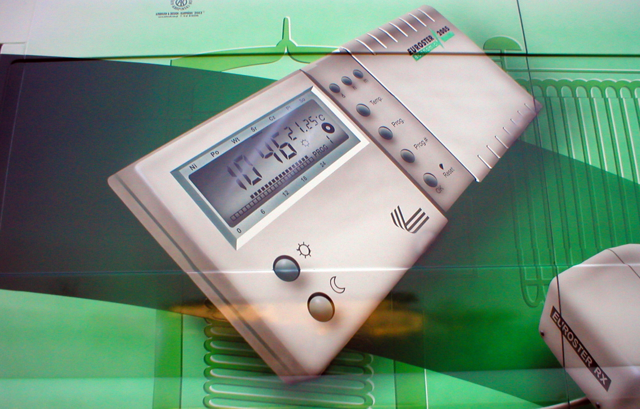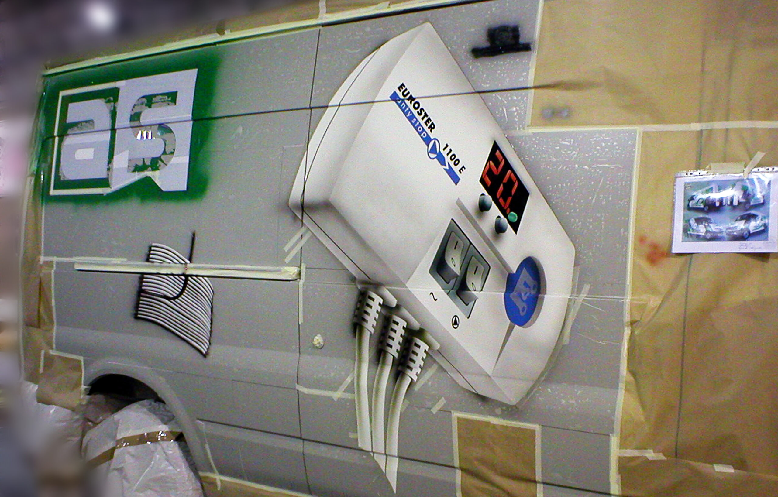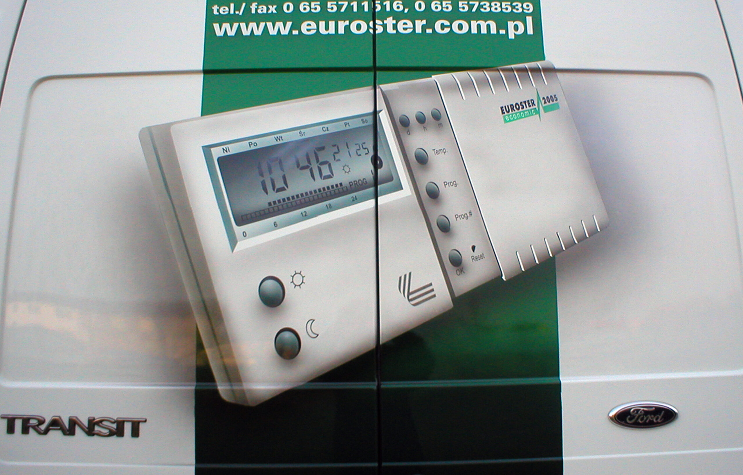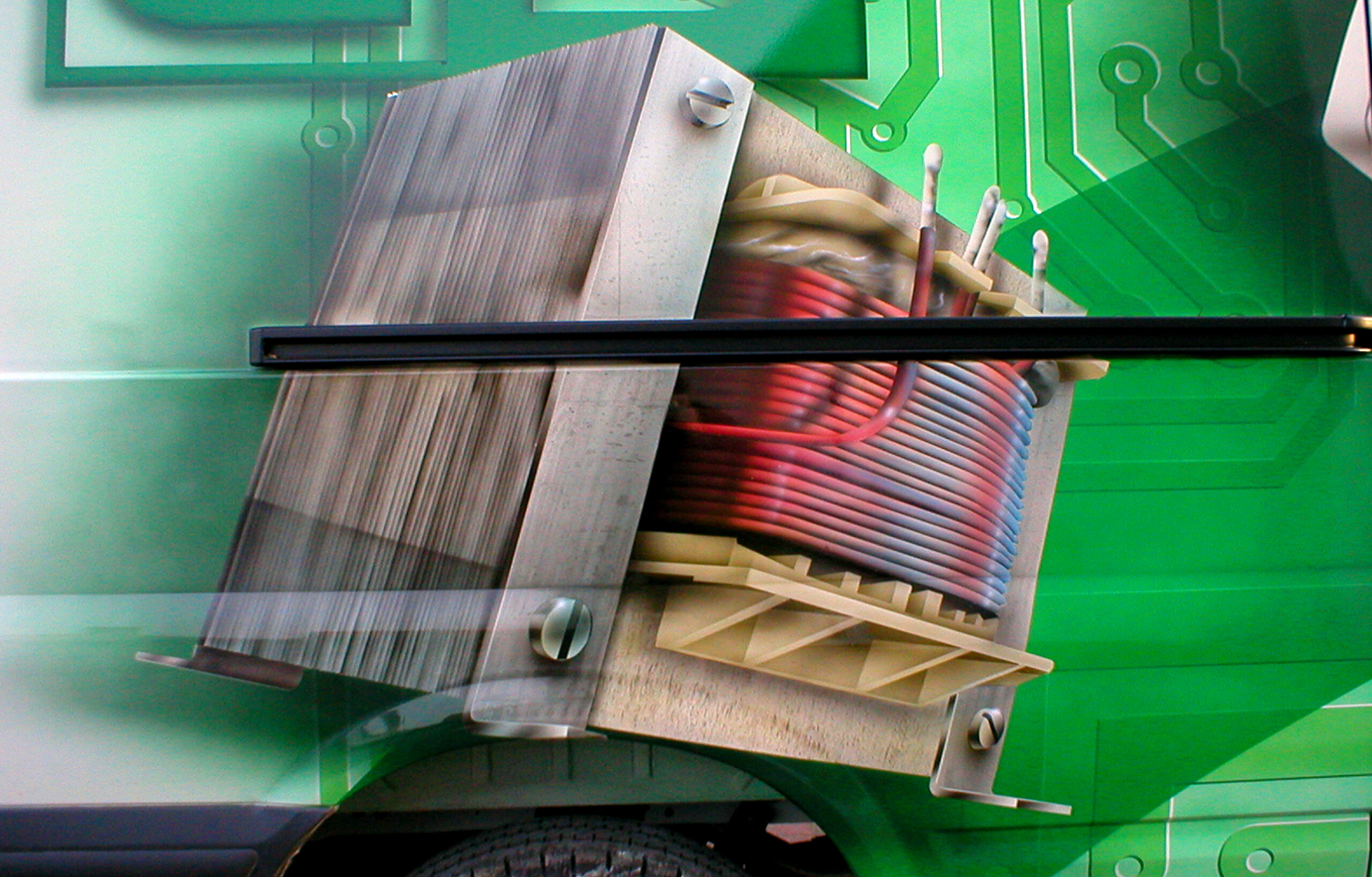 Przedstawiam dzisiaj reklamę transformatorów i elektroniki grzewczej wykonaną na samochodzie dostawczym producenta. Cała praca została wykonana w technice Airbrush. Pracę rozpocząłem od projektu. Celem było połączenie elementów graficznych z linią pojazdu, szczególnie z oknami kierowcy i pasażera. Odszedłem od schematu umieszczenia danych adresowych na drzwiach. Głównym elementem konstrukcyjnym kompozycji miał być szeroki, cieniowany w tonacjach zieleni pas, prowadzony od tylnych nadkoli łukiem, omijający okna, aż do nadkoli przednich. Pas ten miał być cieniowany od czerni przy uszczelkach okien kabiny kierowcy, aż do jasnej zieleni przy nadkolach. W celu nadania reklamie elektronicznego charakteru, postanowiłem umieścić na dwóch bokach tło, w postaci drukowanych płytek elektronicznych w dużym powiększeniu. Samochód nabrał głębokiej, zielonej tonacji. Na jej tle bardzo silnie kontrastowały białe sterowniki ogrzewania i miedziane zwoje kondensatorów. Produkty oraz logo firmowe rozmieściłem w oparciu o szeroki pas zieleni, zachowując zasadę równowagi optycznej.