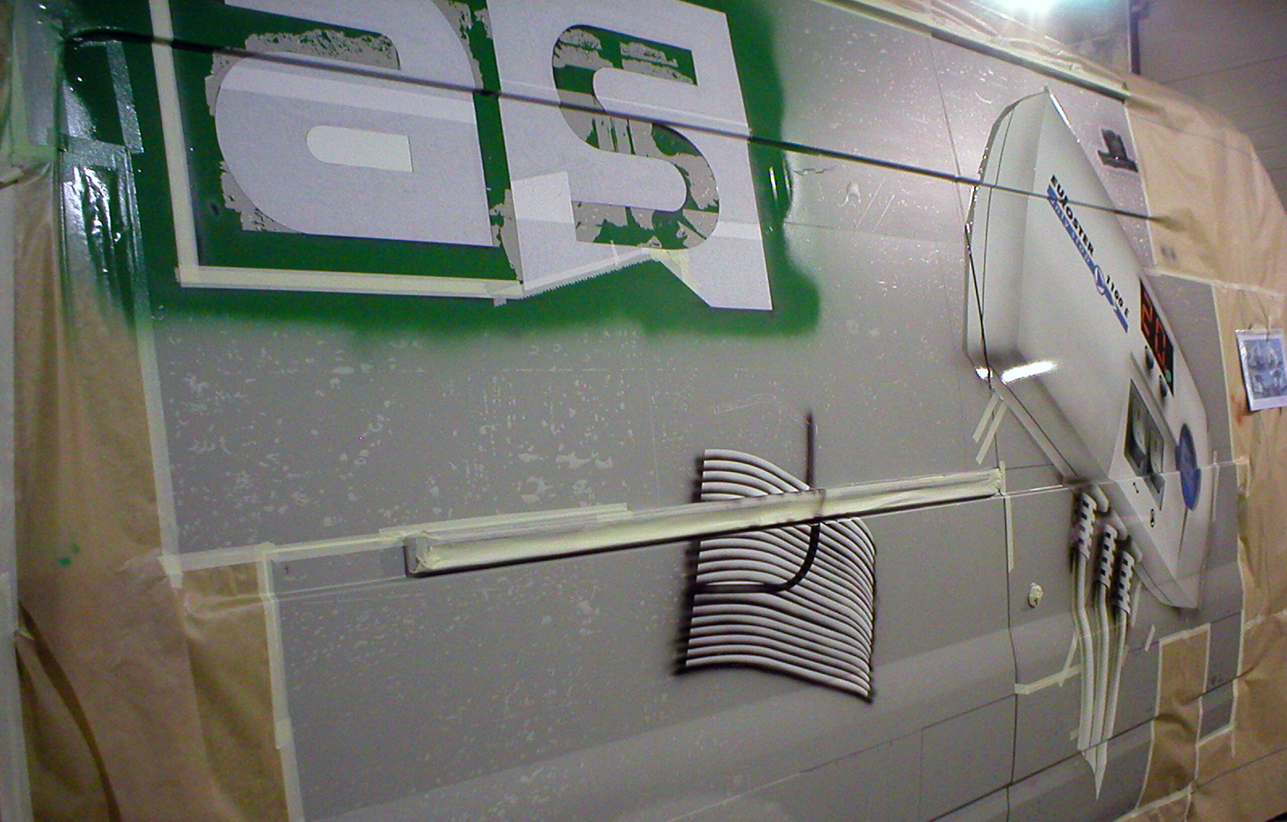 Zachowując odwrotną zasadę niż zwykle, rozpocząłem malowanie od miejsc najjaśniejszych. Najpierw powstały białe korpusy sterowników. Obiekty te składały się z wielu detali; przyciski z opisami, czytniki LED, itp. Gdy szczegóły sterowników były ukończone, zakryłem je w celu całościowego wycieniowania ich brył. Tutaj uwaga, aby nie cieniować białych powierzchni czystą czernią gdyż może to doprowadzić bardziej do efektu „brudu” niż do światłocienia. Najlepiej przygotować kolor pochodny od koloru głównego, lecz o kilka tonów ciemniejszy. Ważne jest również dokładne oczyszczenie podłoża z resztek kleju po folii szablonowej, gdyż cieniowanie po źle oczyszczonej powierzchni daje nieodwracalny rezultat w postaci plam i przebarwień. Po namalowaniu sterowników przykryłem je cienką warstwą lakieru bezbarwnego.