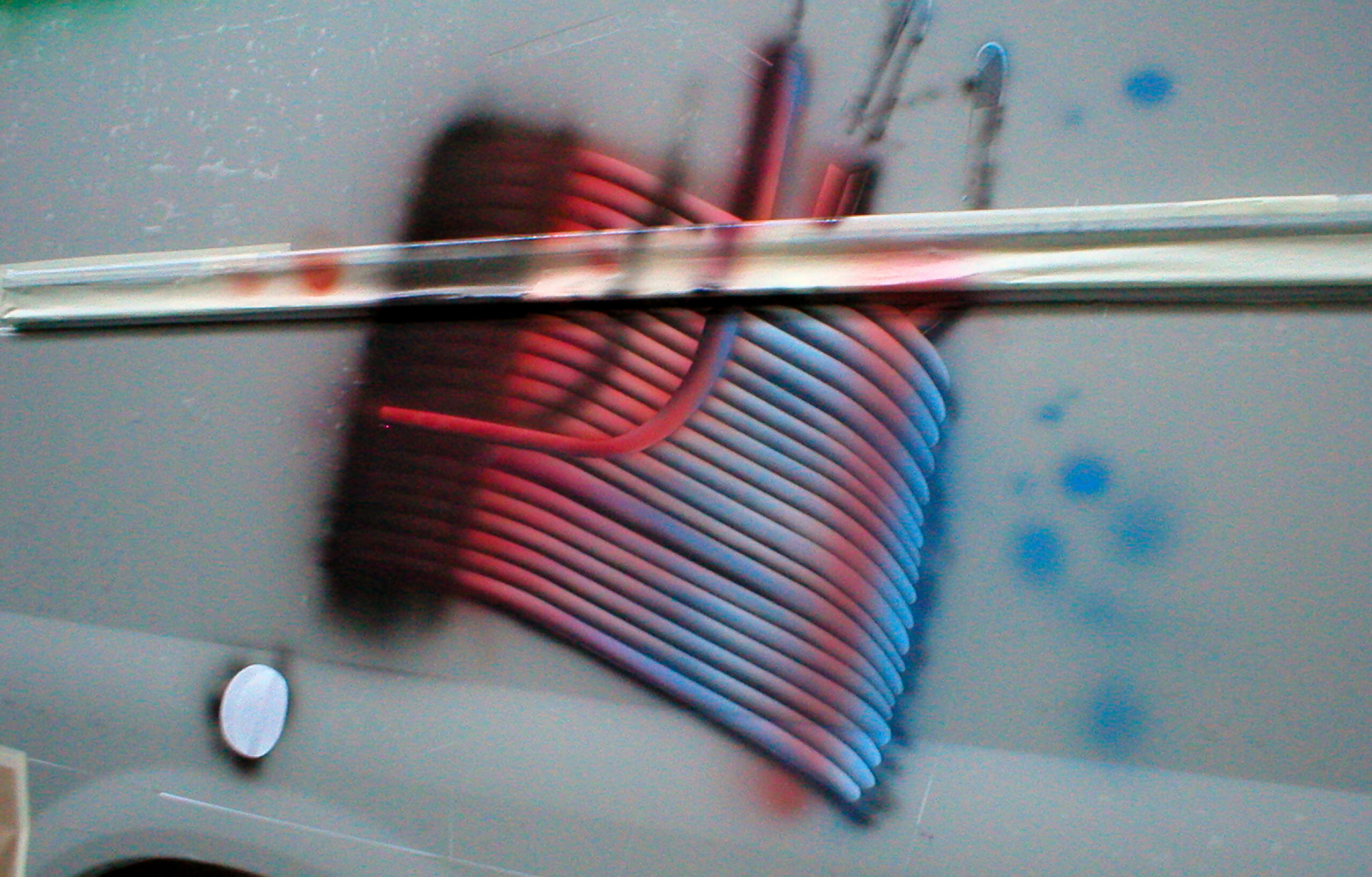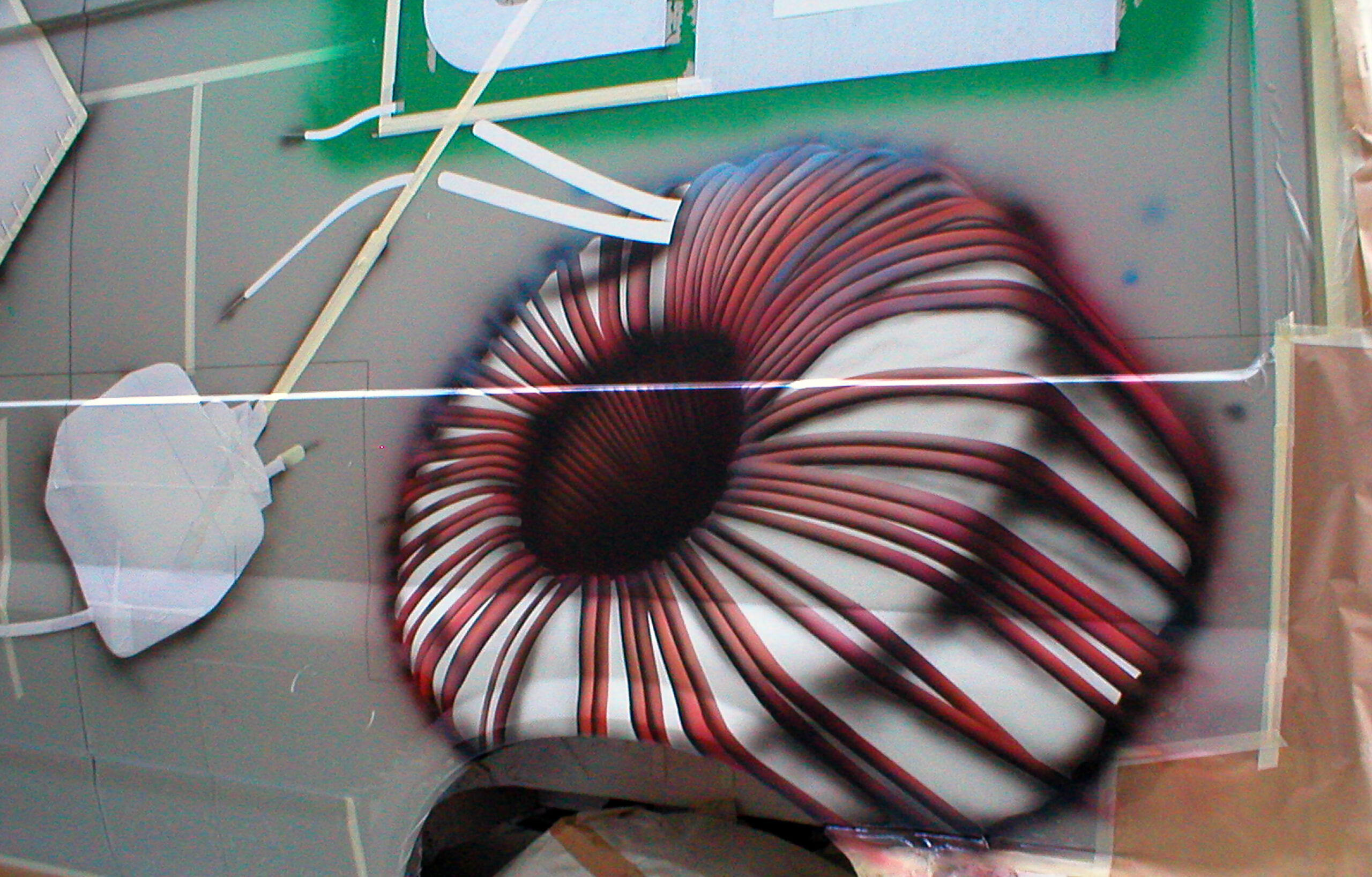 W czasie utwardzania się lakieru bezbarwnego rozpocząłem malowanie transformatów. Ich najtrudniejszym, lecz zarazem najefektowniejszym elementem, były zwoje drutów miedzianych. Każdy z drucików został namalowany osobno, a potem wszystkie razem wycieniowane z efektem błękitnego efektu utlenienia miedzi. Wymienione czynności dotyczą zarówno transformatora okrągłego jak i prostokątnego. Dla skrócenia czasu, o ile to możliwe, staram się malować wiele elementów równolegle. Dzięki temu uzyskuję również spójność kolorystyczną i wyrównany światłocień. W celu opracowania przestrzeni obok transformatorów, zakryłem szablonami ich zwoje miedzianych drutów. Do opracowania pozostał jeszcze naoliwiony, foliowy papier izolacyjny oraz wyblaknięty izolator z wkrętami mocującymi blaszki radiatorów. Powyższe prace wykonałem bez szablonów samoprzylepnych. W celu uzyskania właściwych faktur, stosowałem przeróżne zabiegi artystyczne; drapanie, przecieranie, itp. Następnie zdemontowałem szablony zasłaniające zwoje drutu i wycieniowałem całość transformatorów. Gdy optycznie stanowiły już całość, naniosłem kolejna warstwę lakieru bezbarwnego z utwardzaczem.