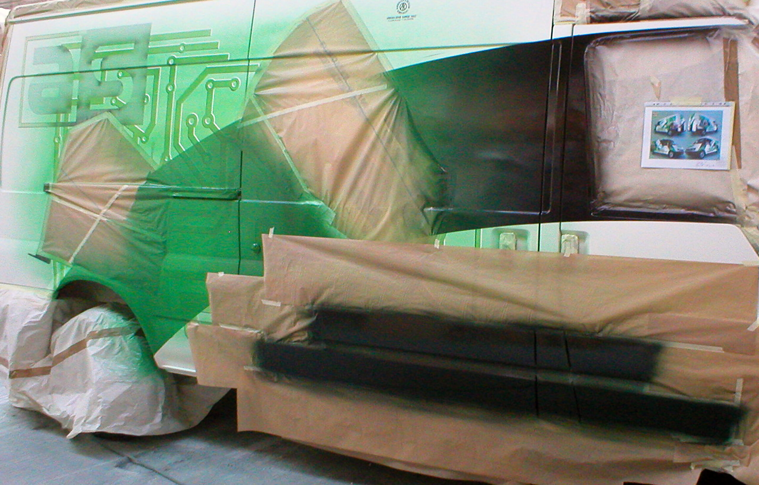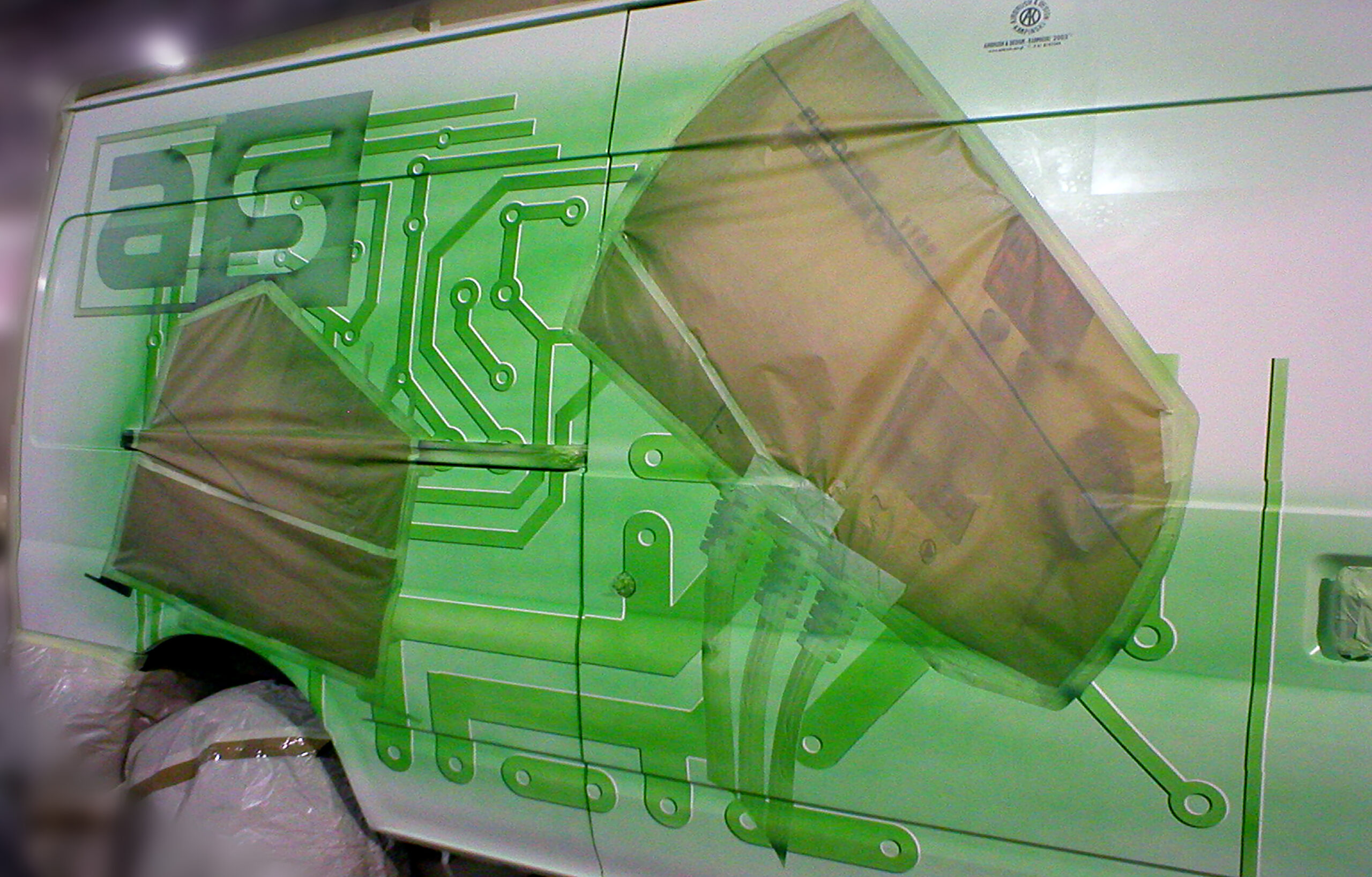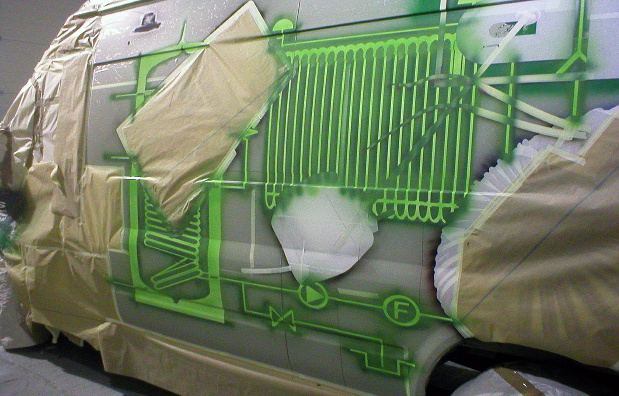 Podobne czynności wykonywałem malując z trzech stron pojazdu logo klienta. Teraz rozpoczęło sie malowanie tła. Zamaskowałem wszystkie namalowane obiekty i rozpocząłem ściąganie najciemniejszych elementów tła. Pokryłem je zielonym lakierem. To samo powtarzałem systematycznie, ściągając coraz jaśniejsze części elektronicznych ścieżek. W rezultacie uzyskałem dość skomplikowany efekt graficzny po obu stronach pojazdu. Po demontażu kolejnych szablonów, tło na całej powierzchni zostało pokryte przeźroczystą zielenią.