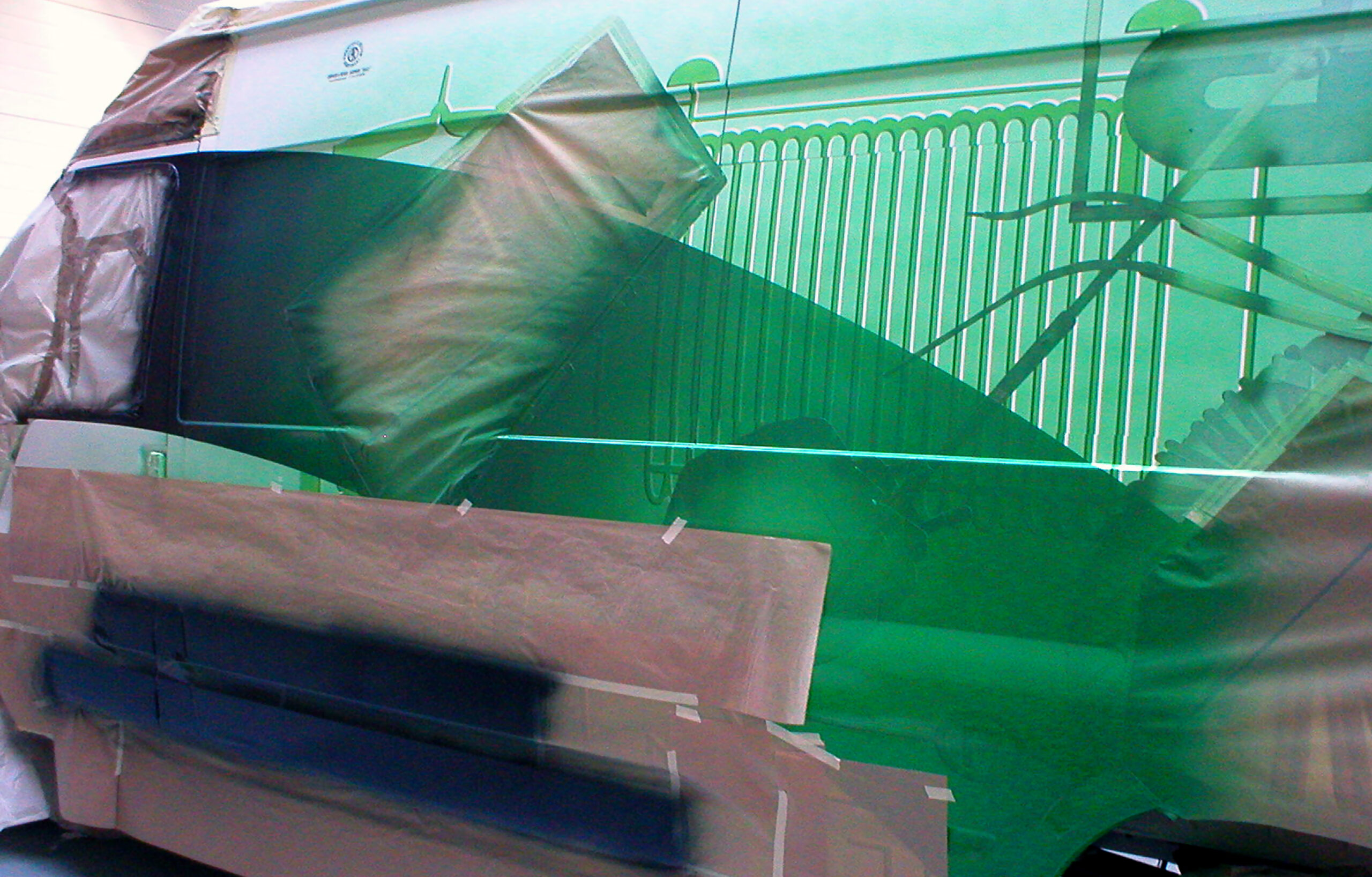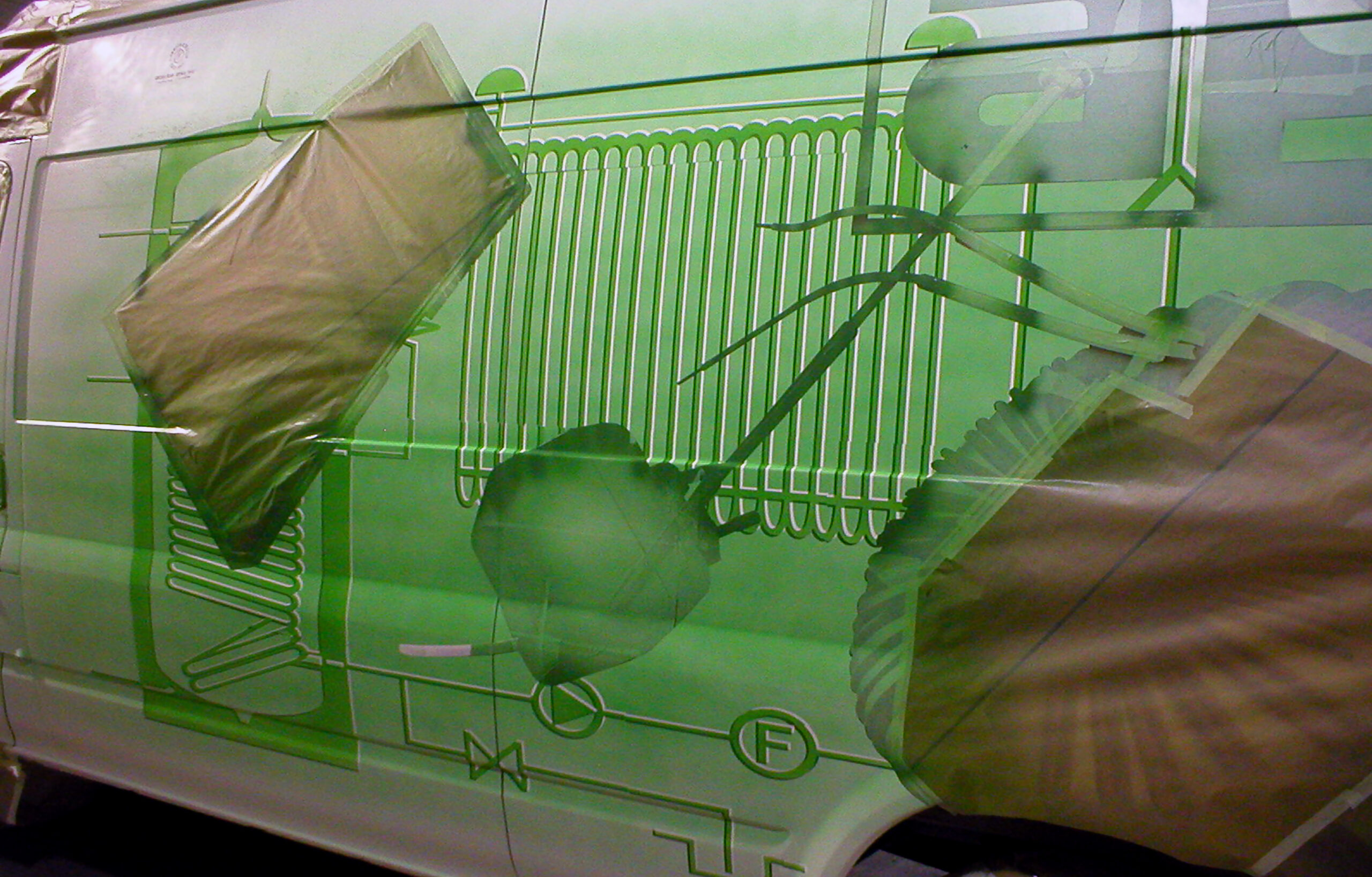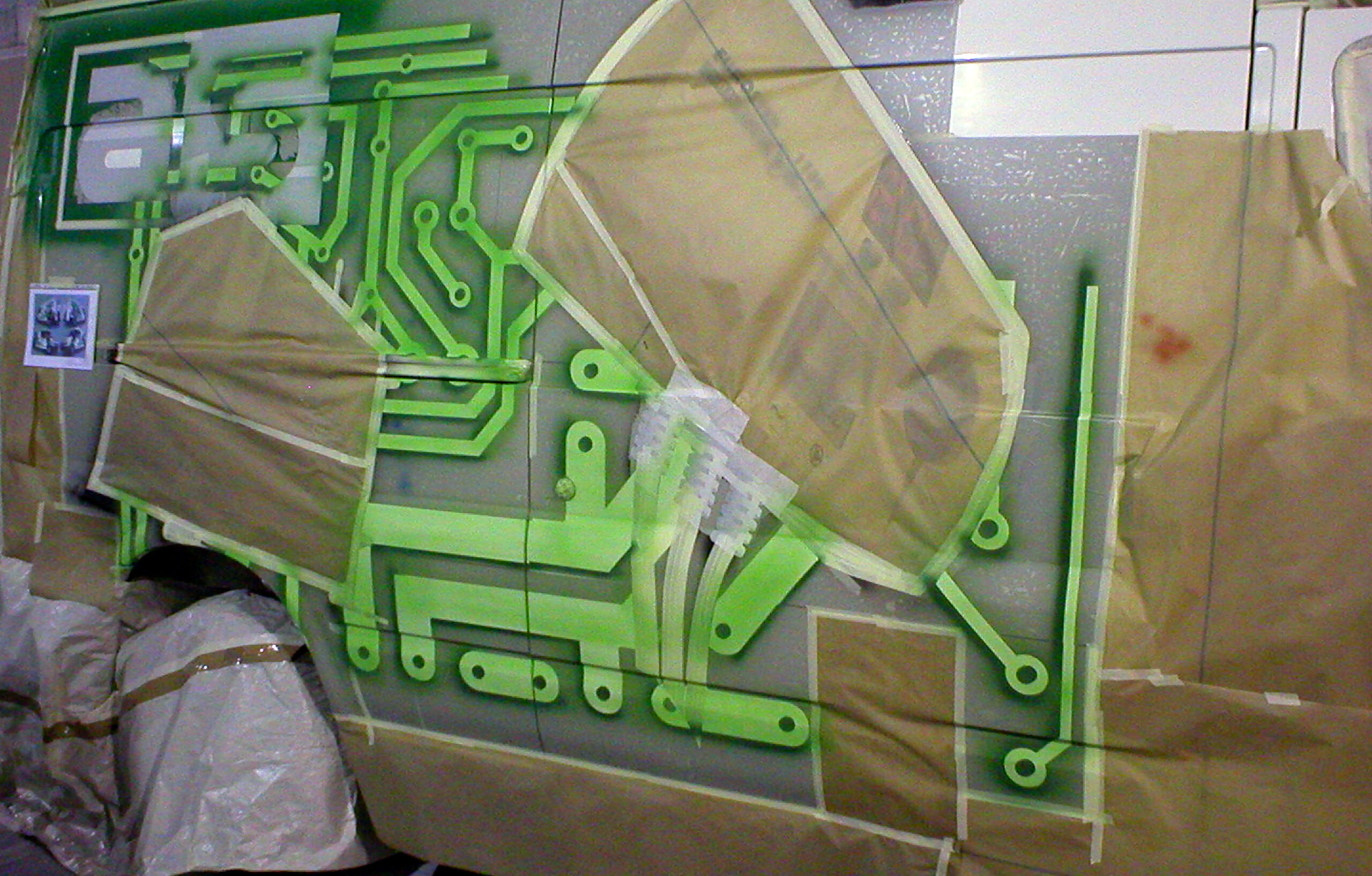 Podobne czynności wykonywałem malując z trzech stron pojazdu logo klienta. Teraz rozpoczęło sie malowanie tła. Zamaskowałem wszystkie namalowane obiekty i rozpocząłem ściąganie najciemniejszych elementów tła. Pokryłem je zielonym lakierem. To samo powtarzałem systematycznie, ściągając coraz jaśniejsze części elektronicznych ścieżek. W rezultacie uzyskałem dość skomplikowany efekt graficzny po obu stronach pojazdu. Po demontażu kolejnych szablonów, tło na całej powierzchni zostało pokryte przeźroczystą zielenią.