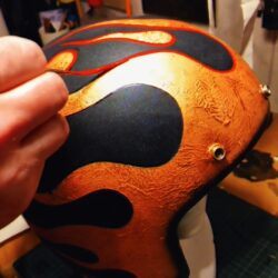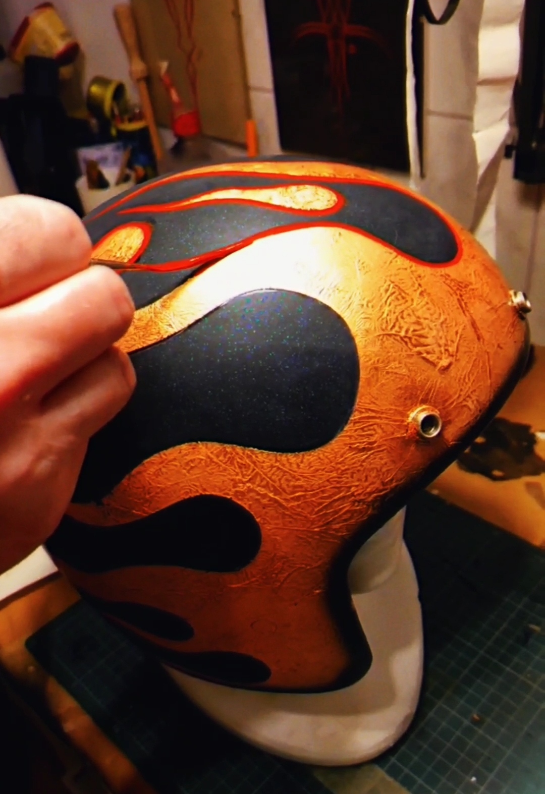 – Płomienie na kasku – mamy tu klasyczny projekt, czyli Ameryka lat 50-tych, 60-tych. Brokaty, ręczne szparunki, klasyczne płomienie – pokazuje nam kolejny kask.