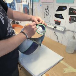 Wśród prezentowanych prac nie zabrakło projektów osobistych. Kask z symbolem Godziny „W” i datą 1944 to prywatna własność Grzegorza, nawiązująca do historii Powstania Warszawskiego. Do kompletu powstaje już lampa wykonana ze zbiornika kultowego Komarka, która również otrzyma historyczne grafiki.