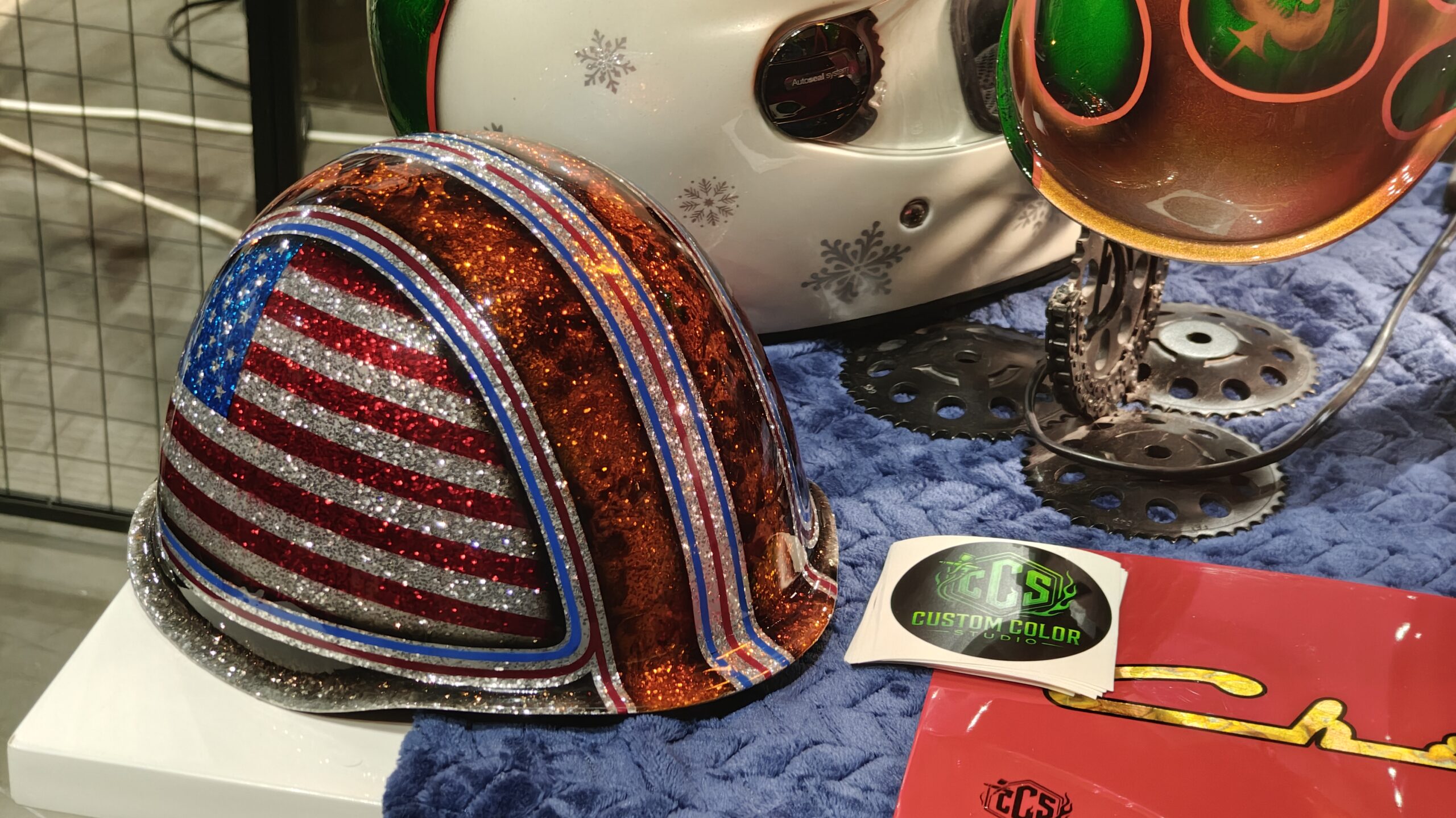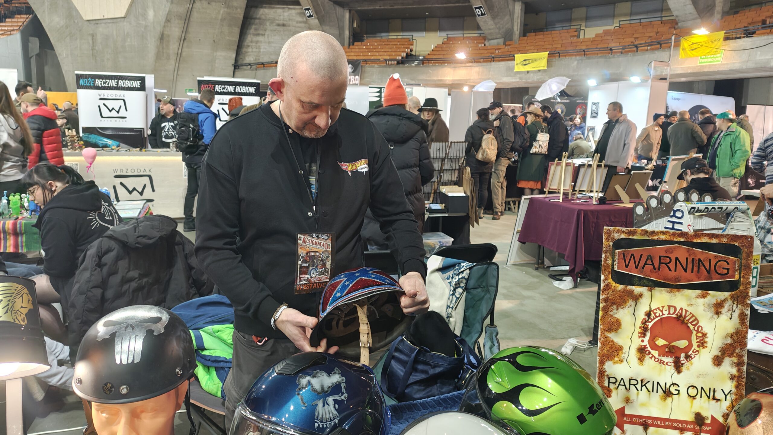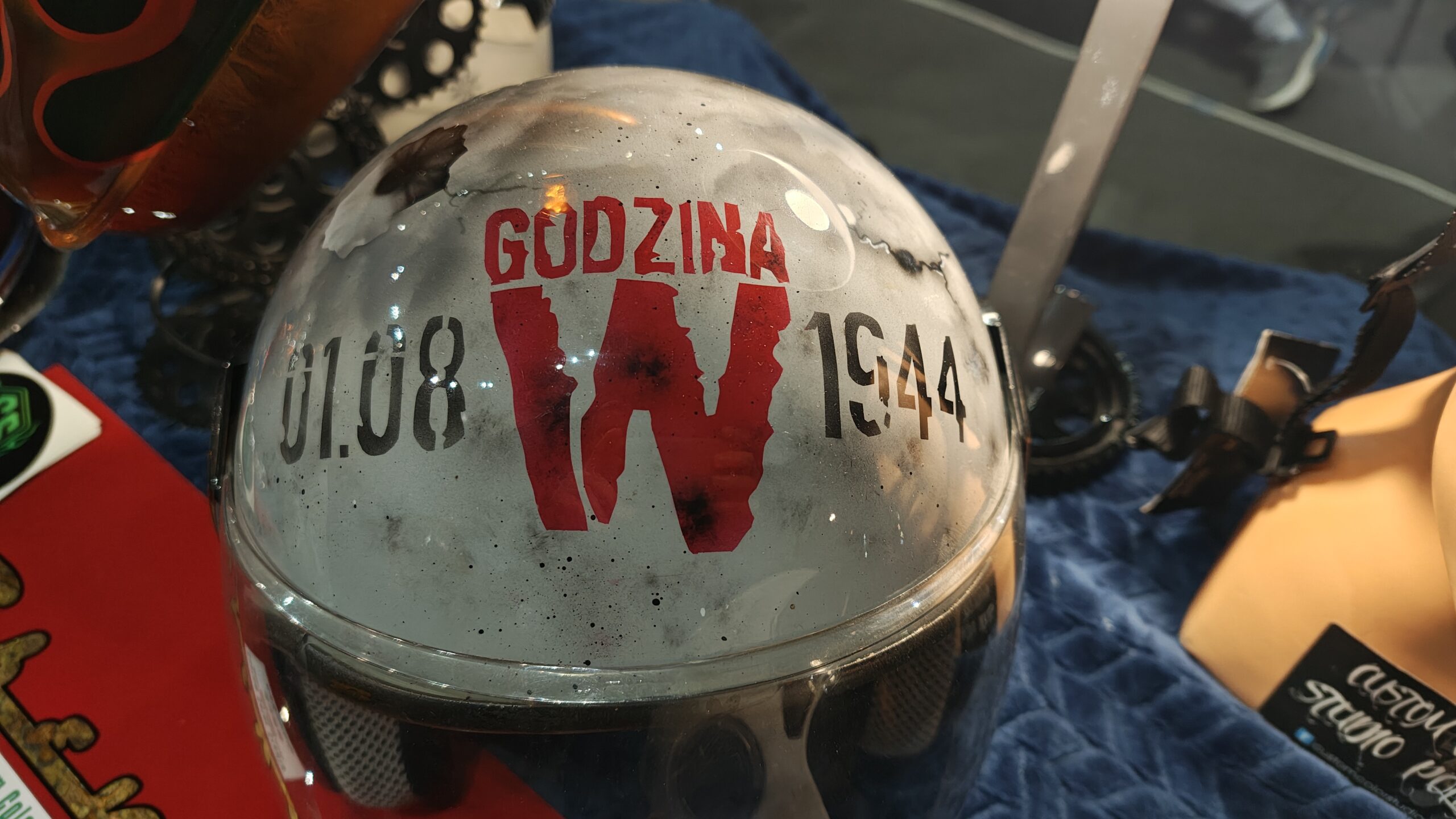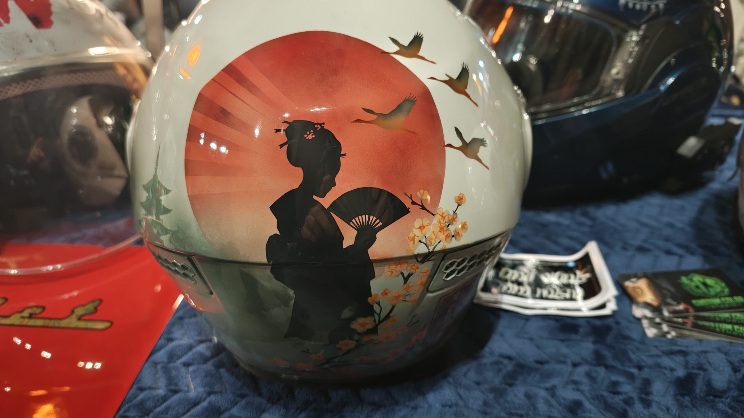Na stoisku we Wrocławiu kaski, które zaprezentował pan Grzegorz opowiadały historię swoich właścicieli. Jeden z nich, wykonany dla posiadacza japońskiej maszyny, bazuje na kolorach perłowych i subtelnych poświatach.