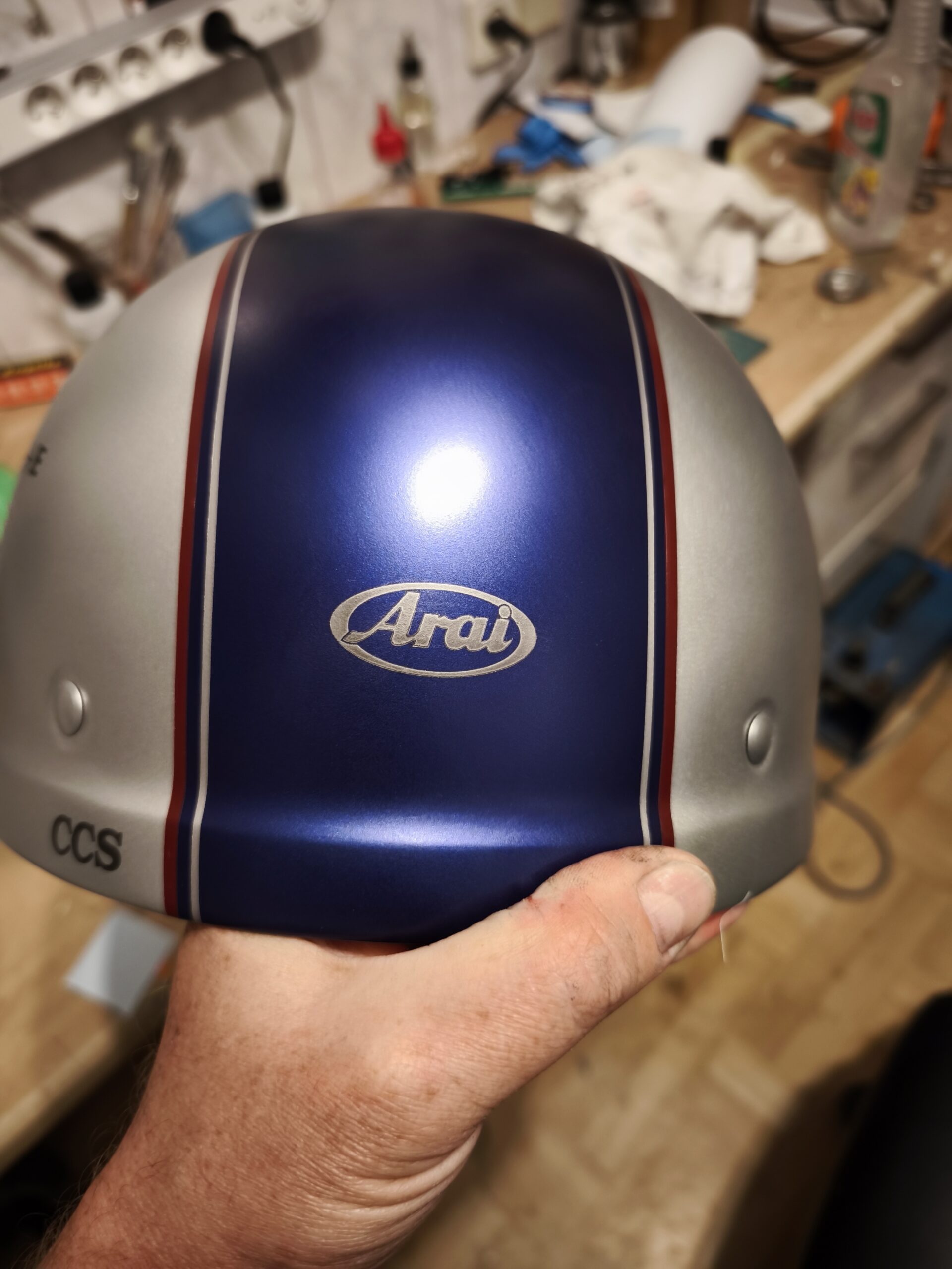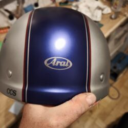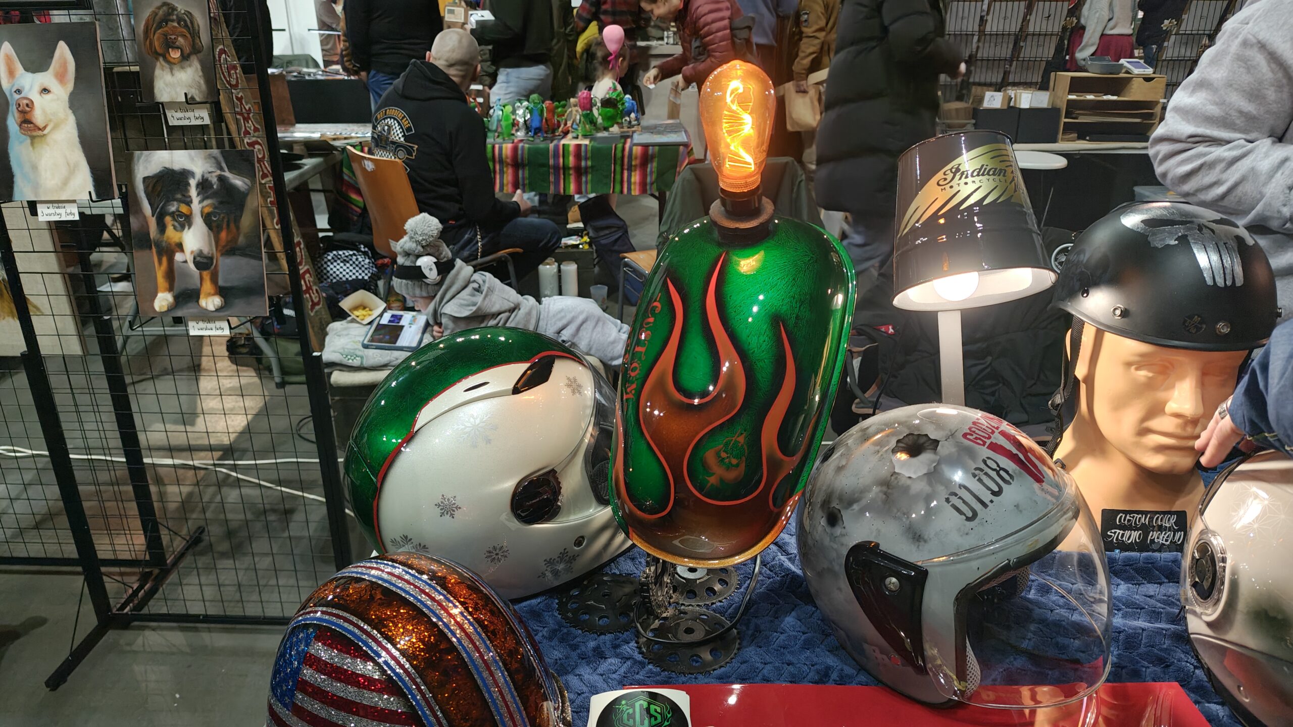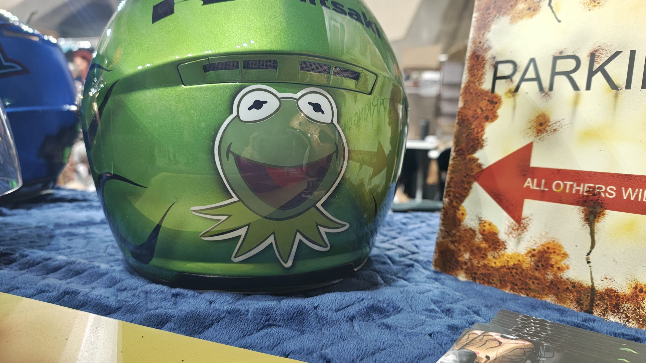 Na stoisku we Wrocławiu kaski, które zaprezentował pan Grzegorz opowiadały historię swoich właścicieli. Jeden z nich, wykonany dla posiadacza japońskiej maszyny, bazuje na kolorach perłowych i subtelnych poświatach.