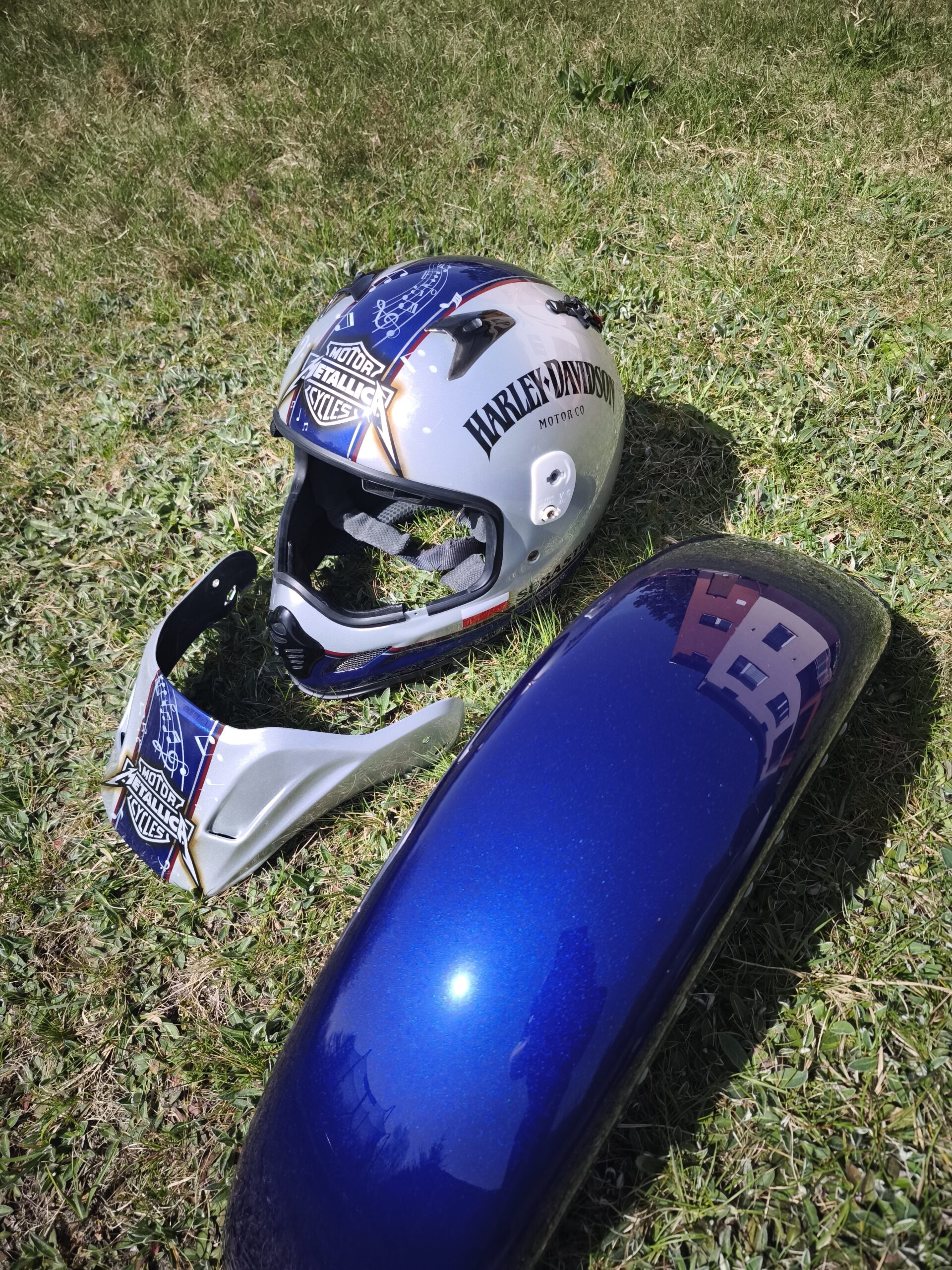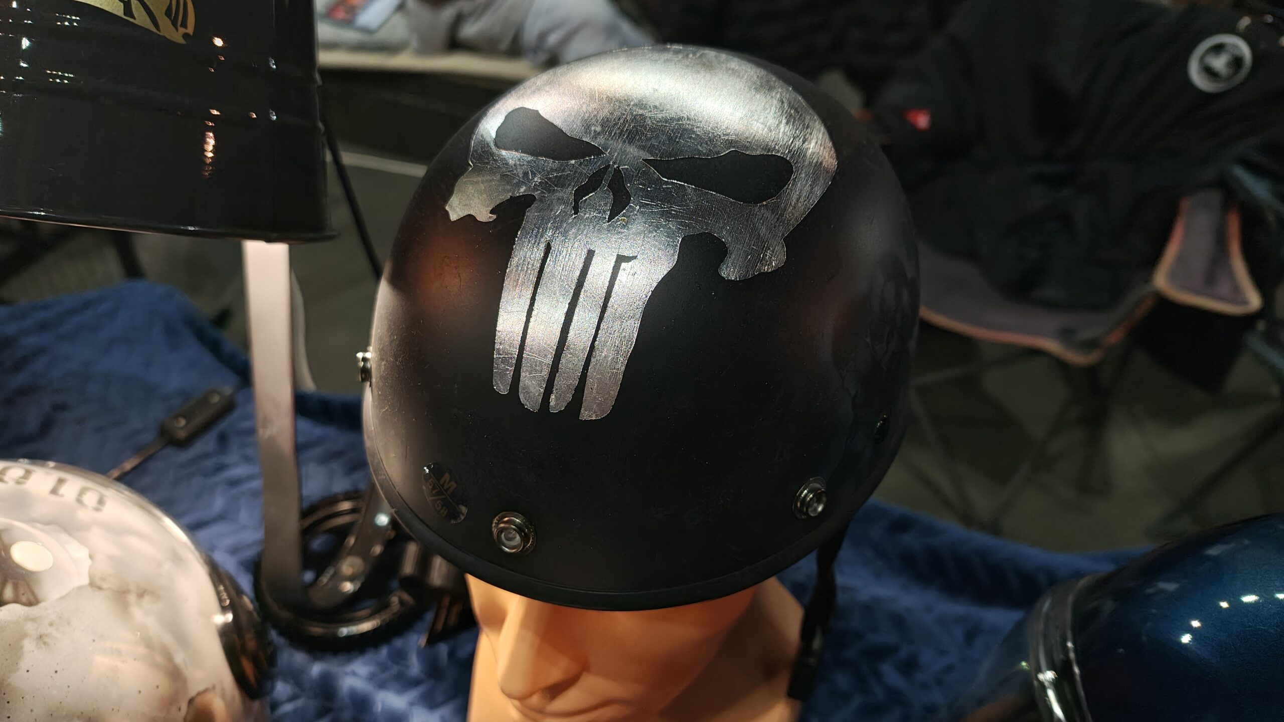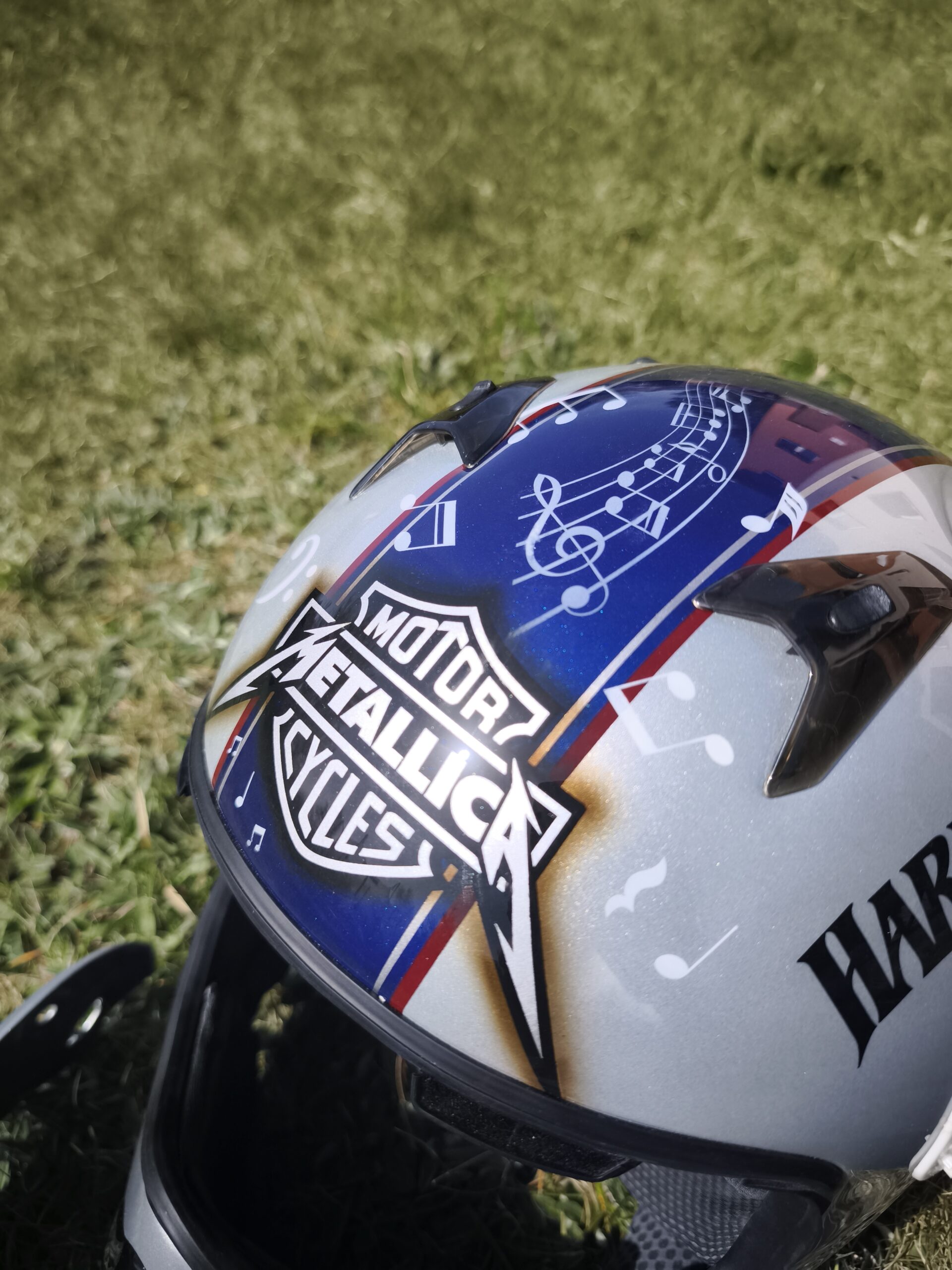 Inny projekt, przyciągający fanów cięższych brzmień, to kask przygotowany na zakończenie sezonu Harleya w Warszawie. To prawdziwa lekcja historii na skorupie: z jednej strony flaga USA, z drugiej flaga Konfederacji, a pośrodku motyw czaszki symbolizujący wojnę secesyjną.