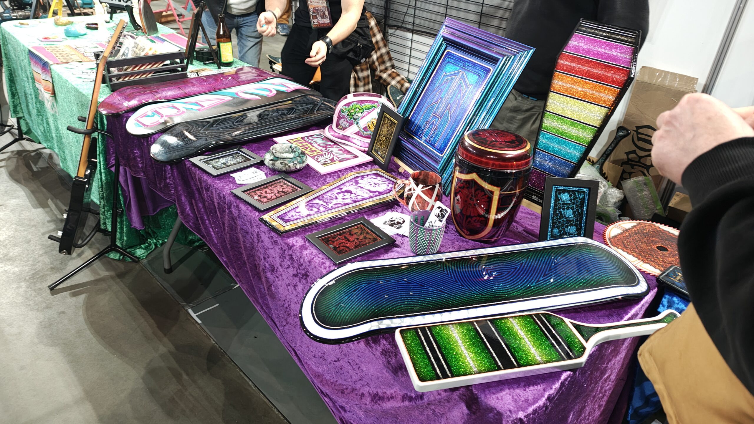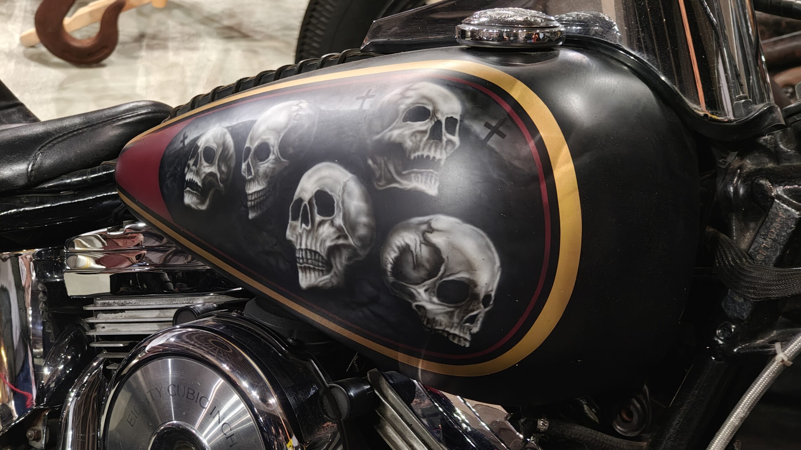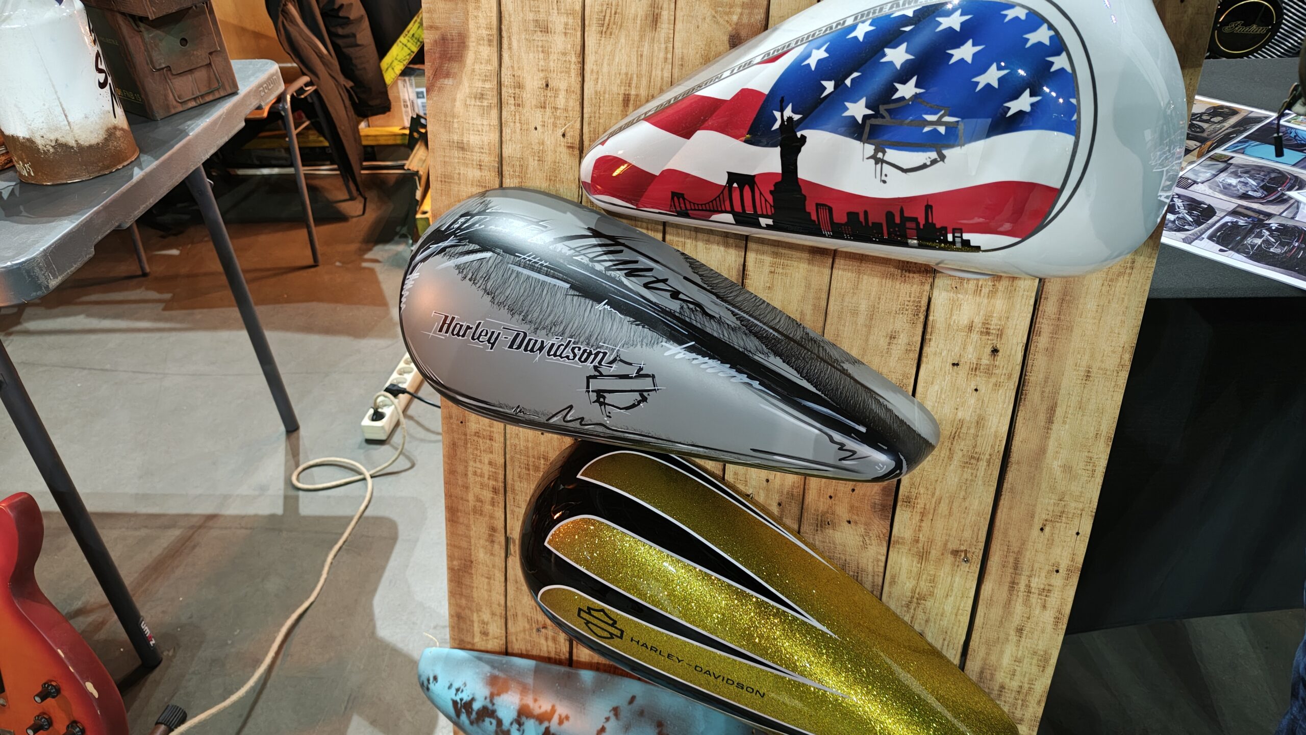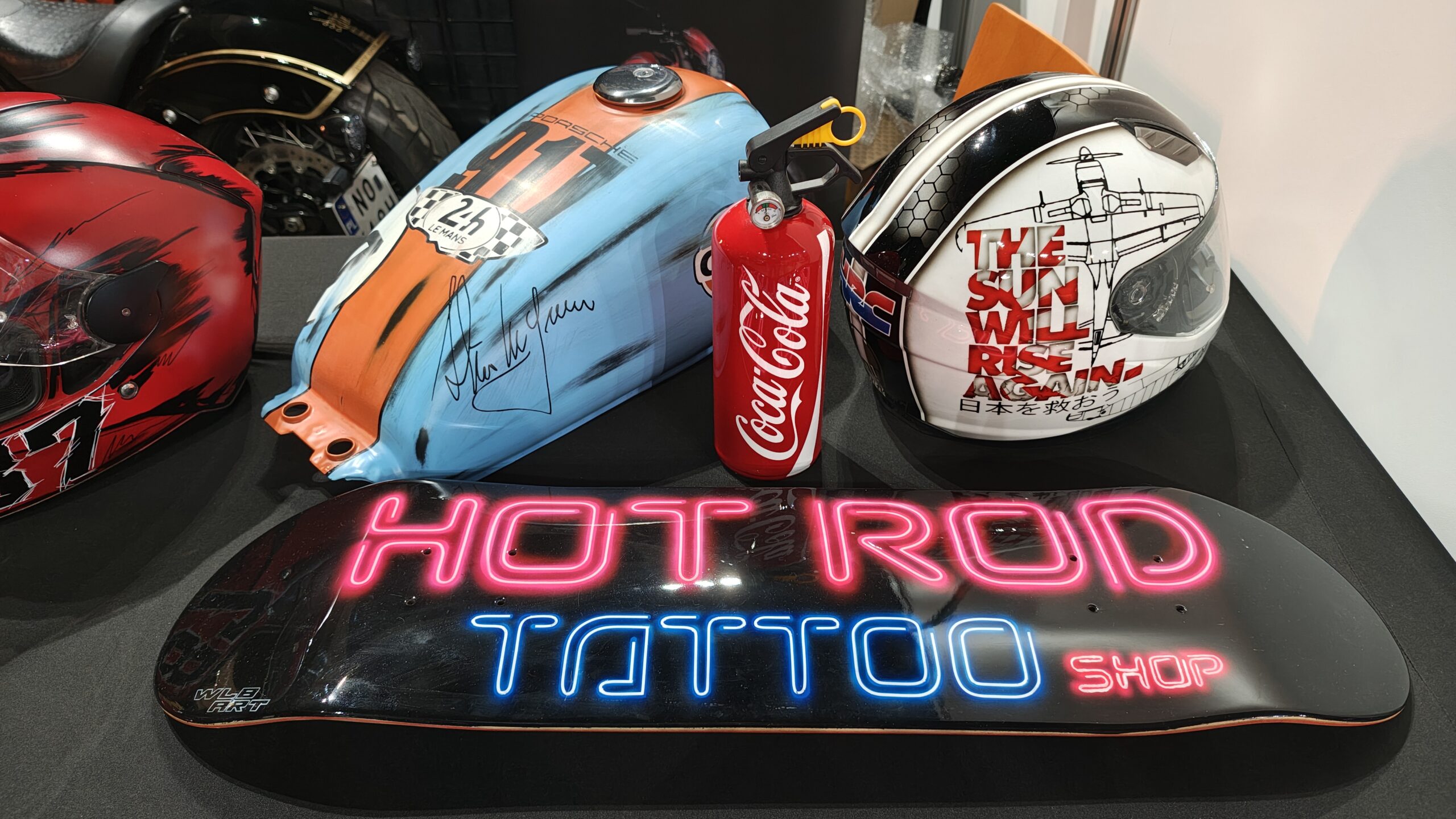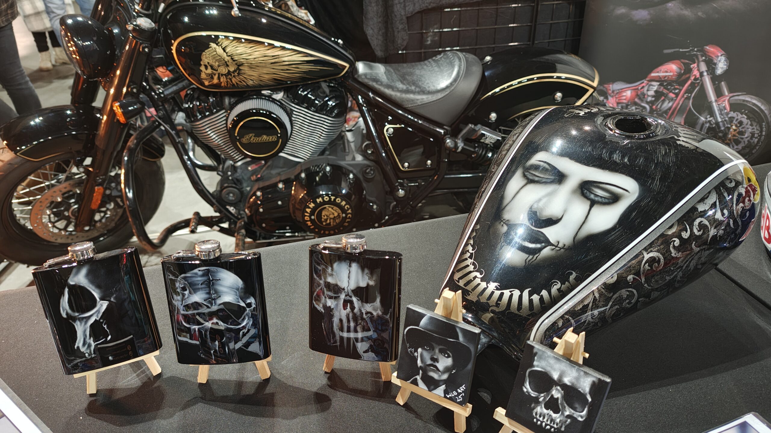 Na stoiskach artystów mogliśmy podziwiać nie tylko motocykle, ale i mniejsze formy: kaski, piersiówki czy zbiorniki paliwa, na których królował pinstriping i realistyczne portrety.