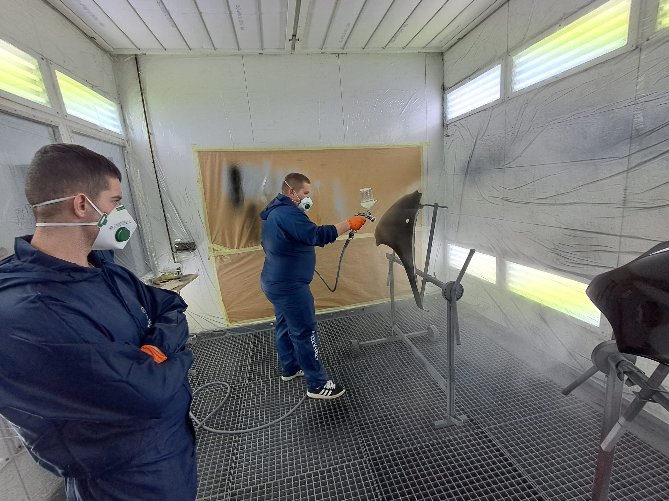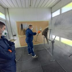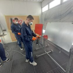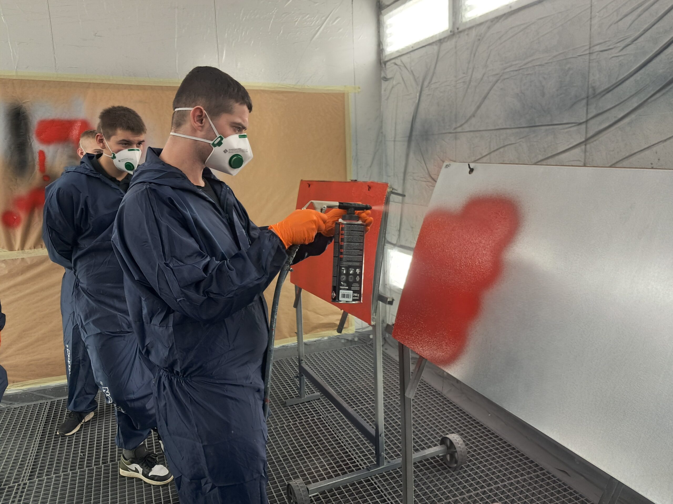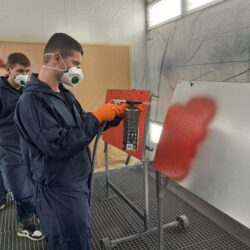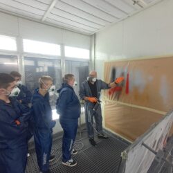 Podczas zajęć uczniowie poznawali cały proces przygotowania powierzchni do lakierowania – od matowania i odtłuszczania, przez dobór odpowiednich materiałów, aż po aplikację podkładów i lakierów.