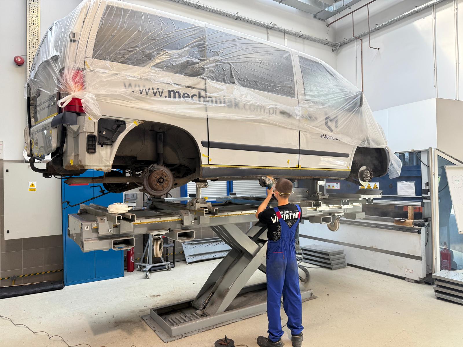 Wchodząc do hali samochodowej białostockiego „Mechaniaka”, łatwo zapomnieć, że to budynek szkoły. Zamiast tablicy i kredy mamy tu stanowiska przygotowawcze, profesjonalną kabinę lakierniczą, ramy naprawcze i mieszalniki, na których uczniowie pracują na co dzień. To efekt pomysłu sprzed ponad dwóch dekad, bo wtedy nikt nie przypuszczał, że szkolny warsztat stanie się tak mocnym punktem na mapie podlaskiej motoryzacji.