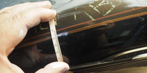 W zasadzie powinienem się cieszyć, bo mając wolną rękę tworzy się najprzyjemniej. Jednak zawsze istnieje obawa, że niekoniecznie trafię w gust drugiego człowieka. Lubię kombinować, więc pomyślałem, że zrobię dwa kolory szare, przetnę je czerwonym paskiem i dodam klin z efektem. Wybór padł na kolor z palety Seata i jaśniejszy z Audi. W ten sposób mogłem przez telefon zapytać: „czy kolor z Audi A6 z roku 2018 będzie ci odpowiadał ?” Potrzebowałem potwierdzenia tylko po to, żeby dalej planować kompozycję na motocyklu. Dużo rozmawiałem o projekcie z właścicielem, pobudzając jego wyobraźnię i podsycając ciekawość. Swoją również. Podczas malowania wzoru wykorzystuję taśmy liniowe o różnej grubości.