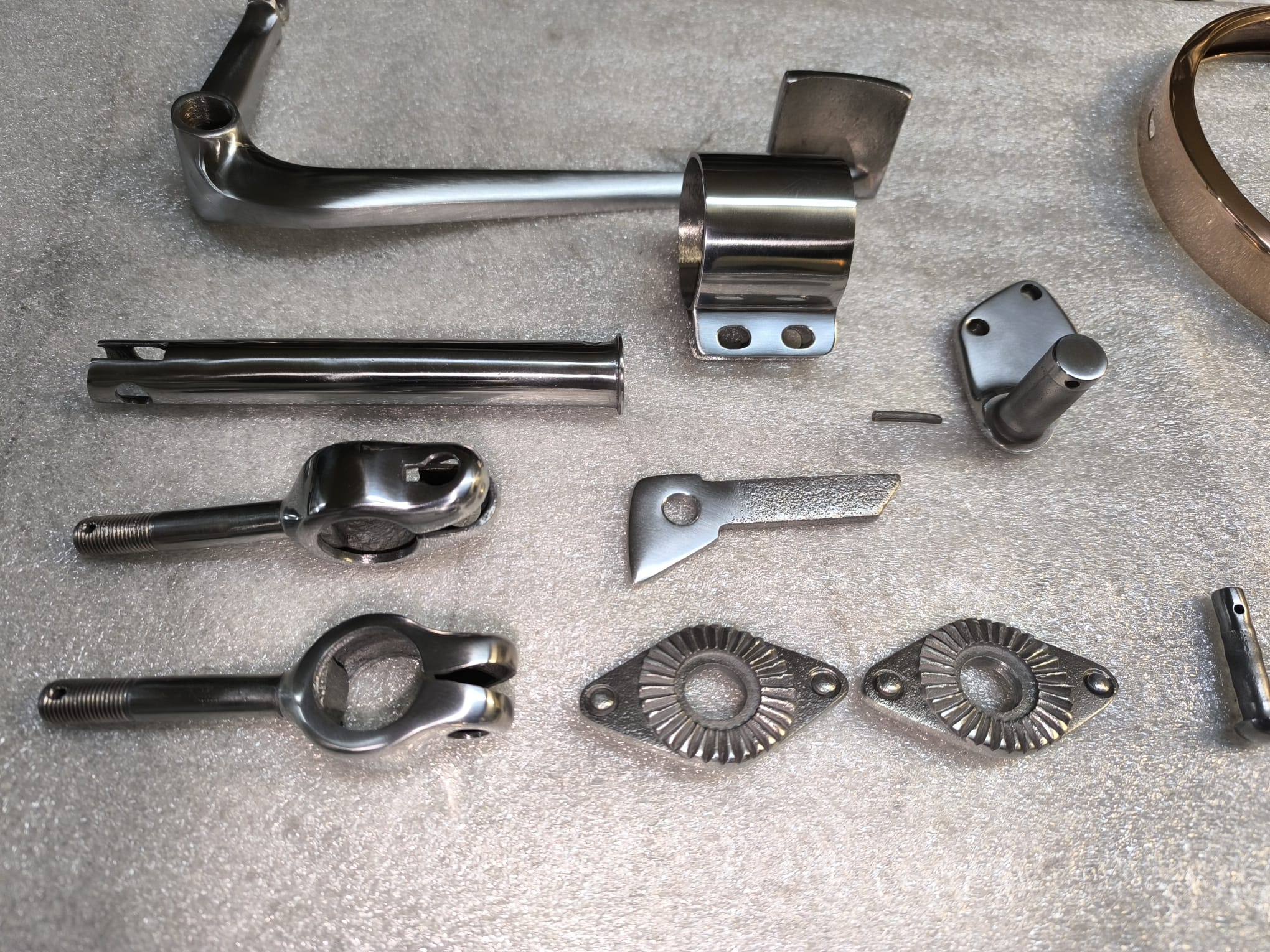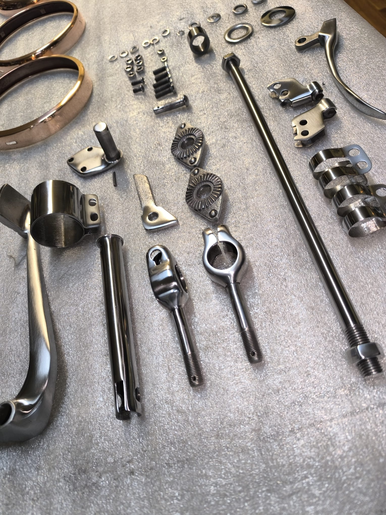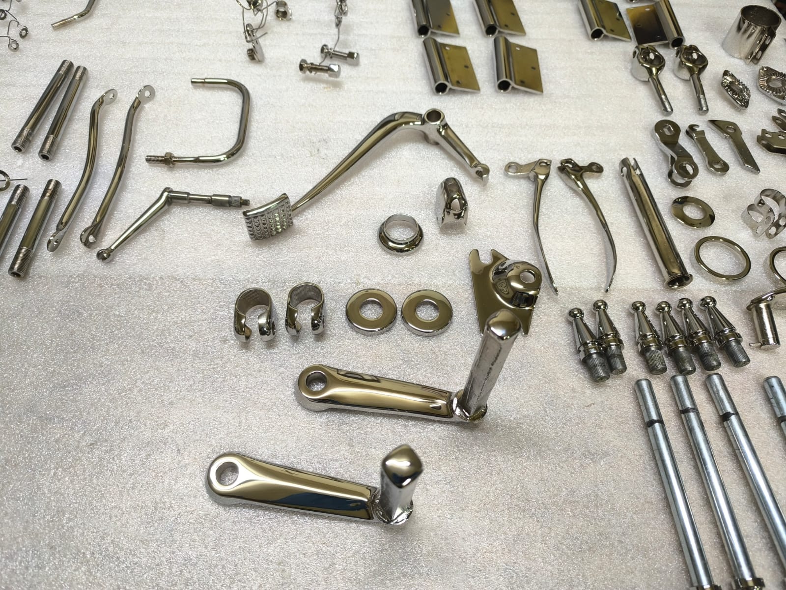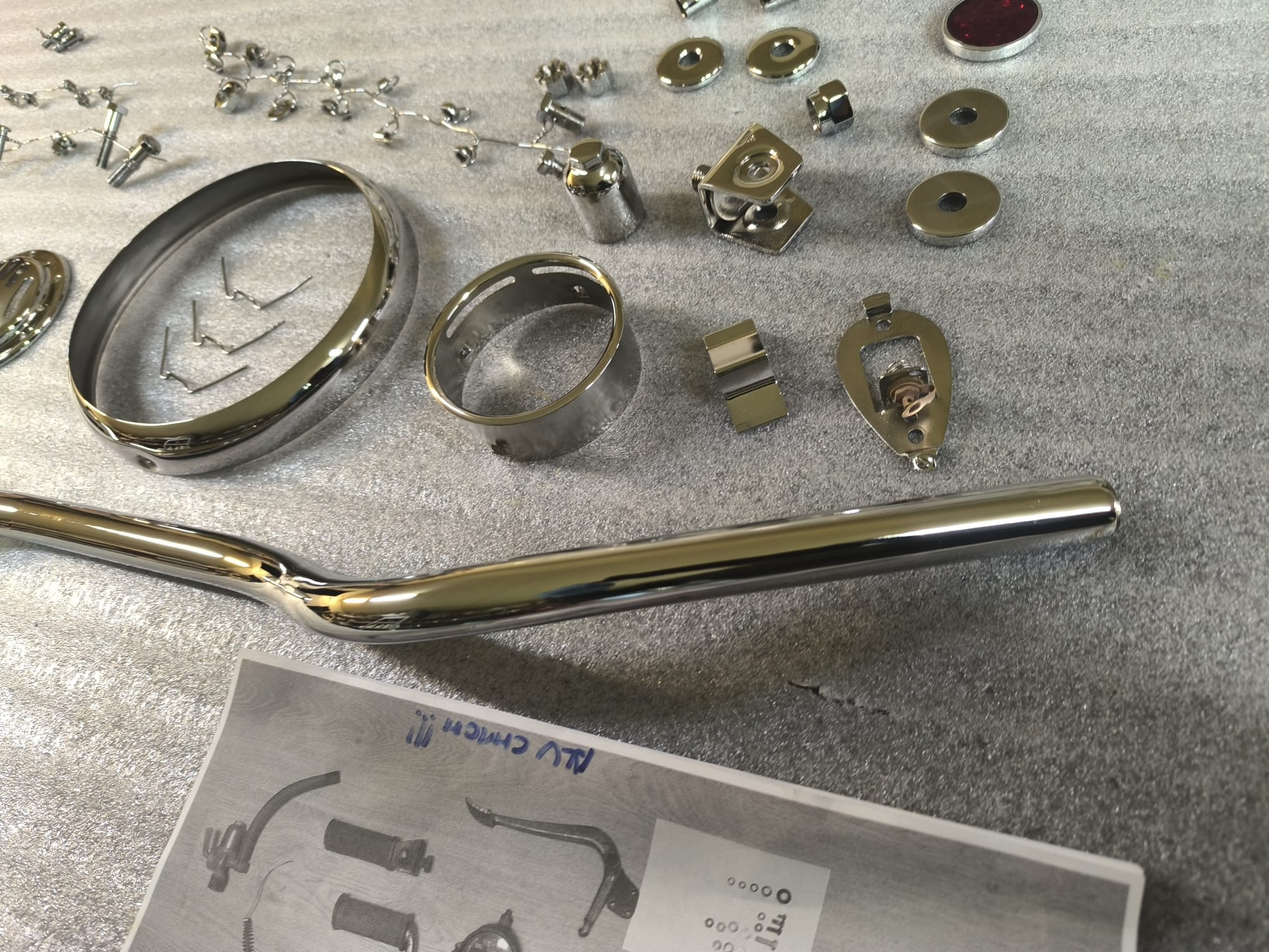 Równolegle trwała renowacja „biżuterii” motocykla. Dźwignie, klamki i obręcze musiały odzyskać fabryczny blask. Zastosowano trzystopniowy proces galwanizacji.