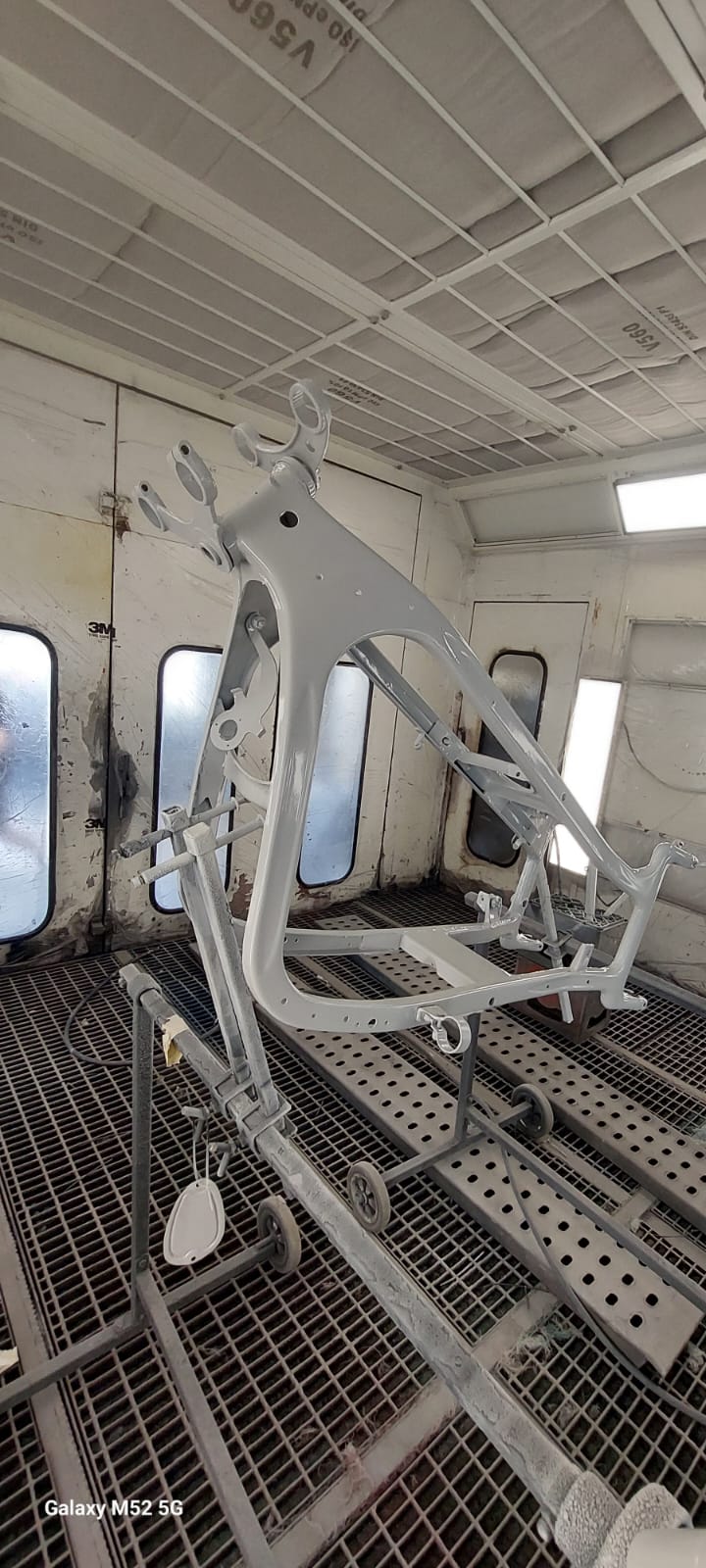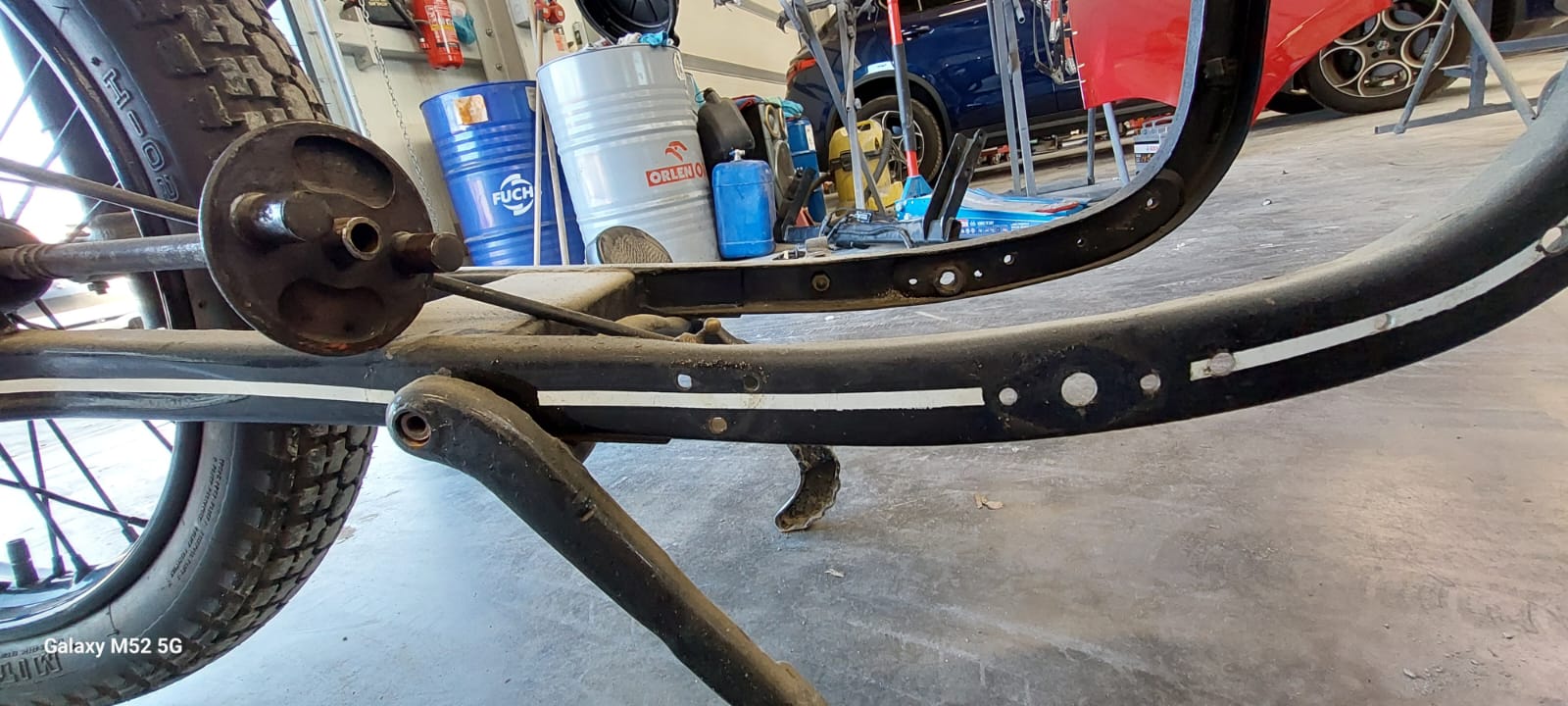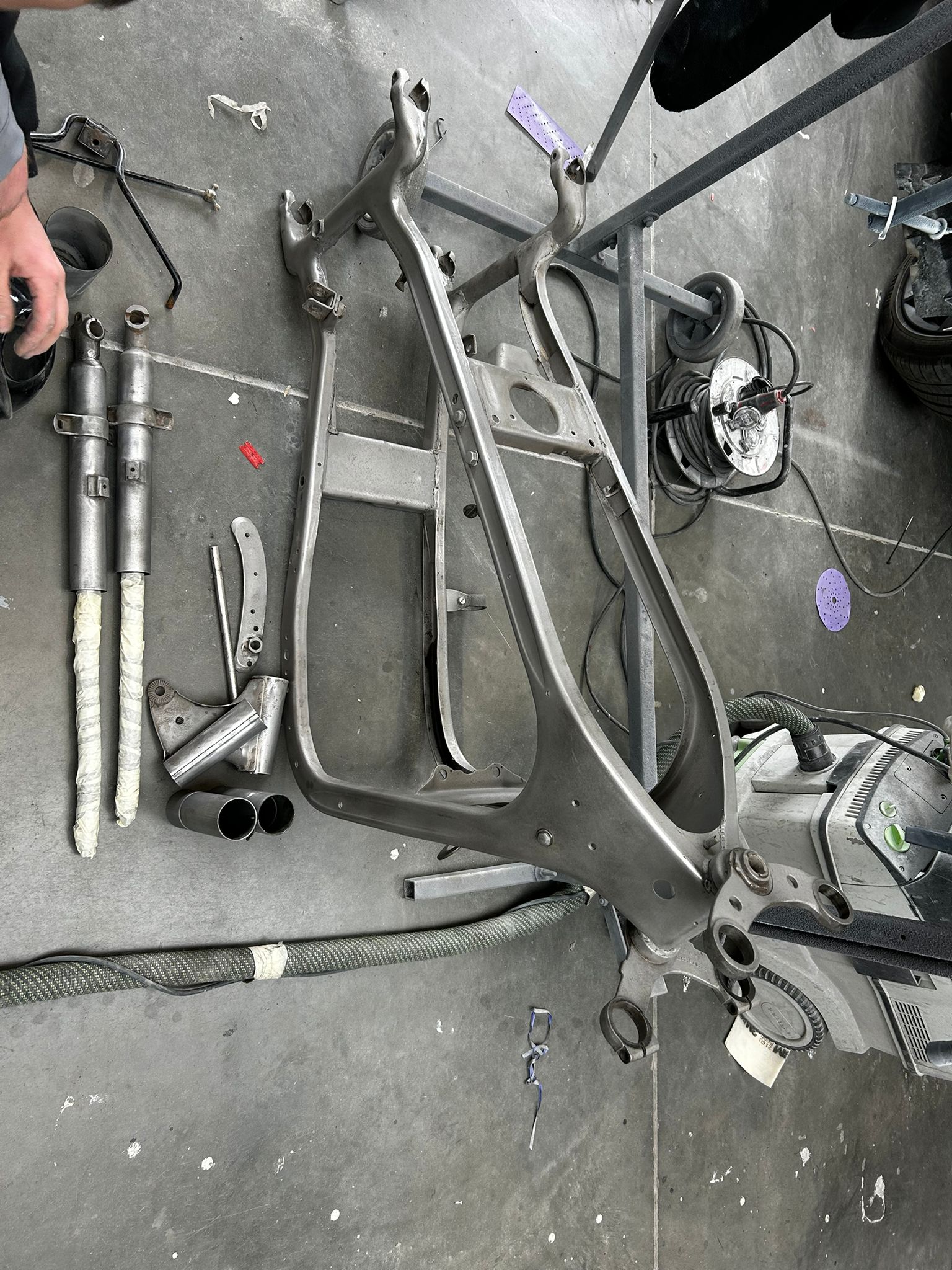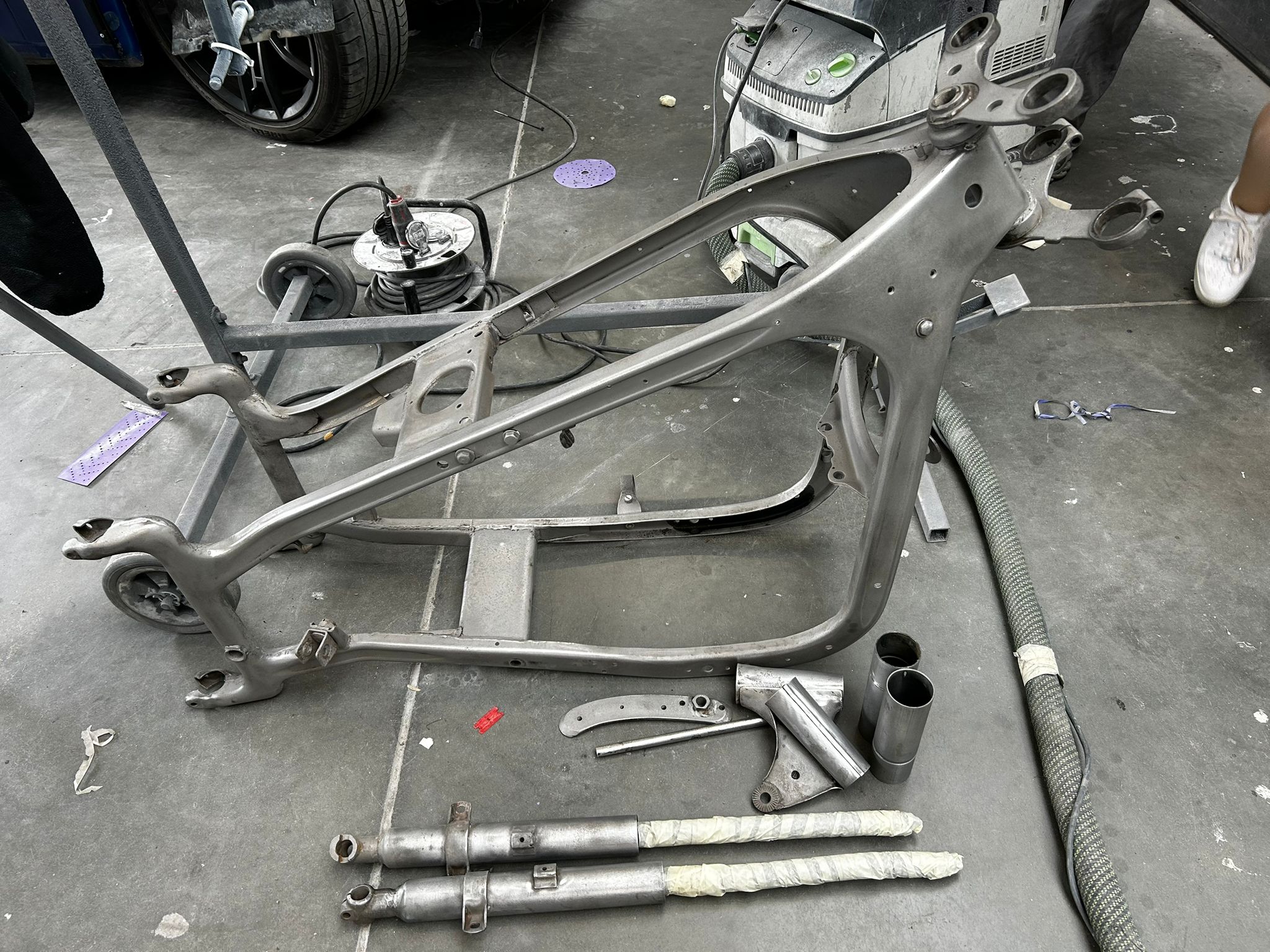 Rama po piaskowaniu ujawniła także usterkę przy uchu amortyzatora. Wszystkie pęknięcia naprawiono metodą TIG, a następnie całą ramę sprawdzono i wyprostowano na ramie kontrolnej, aby zachować fabryczną geometrię.