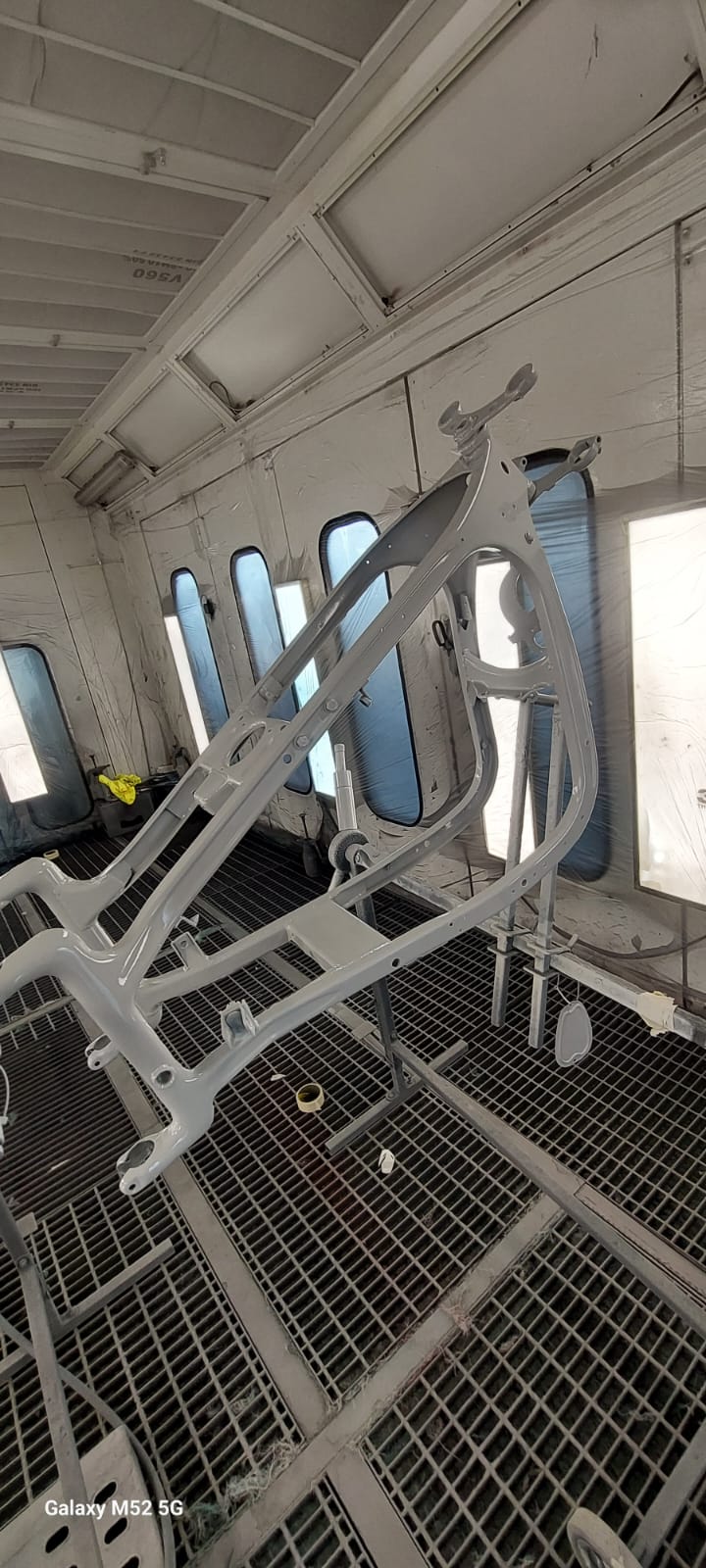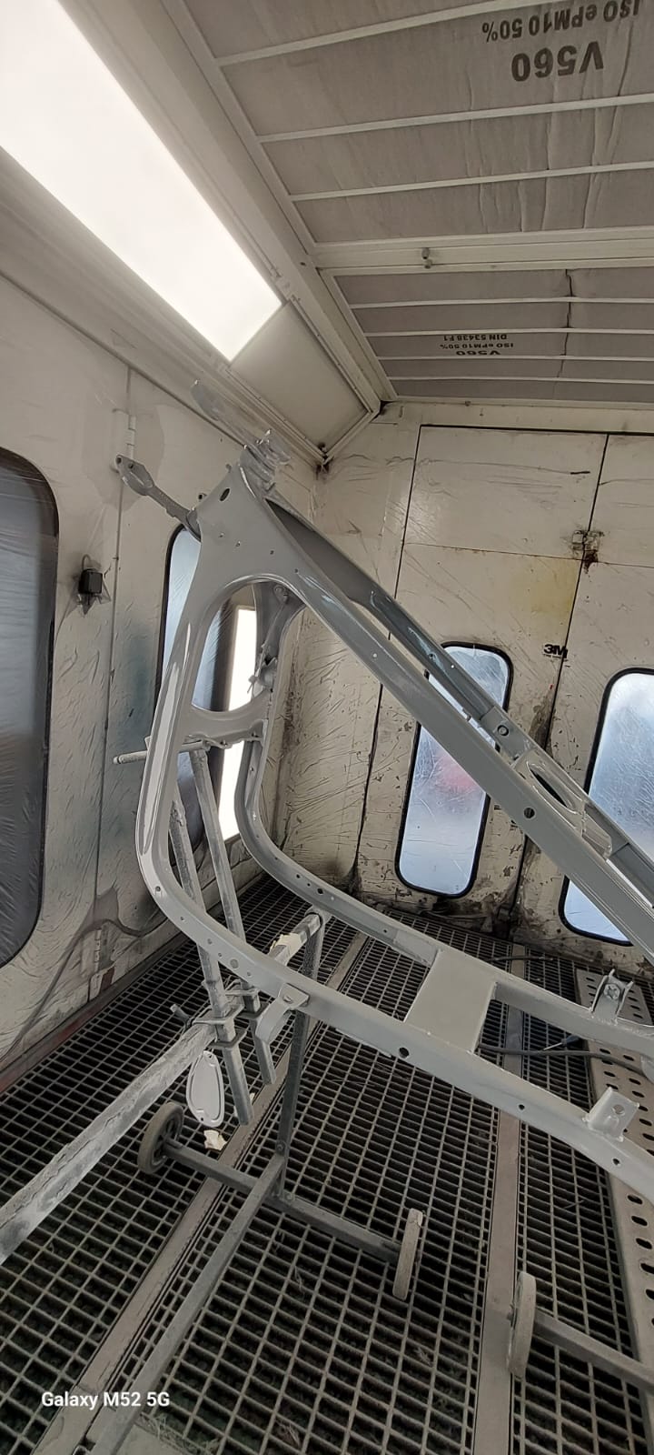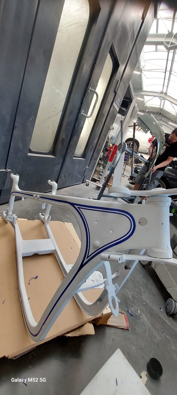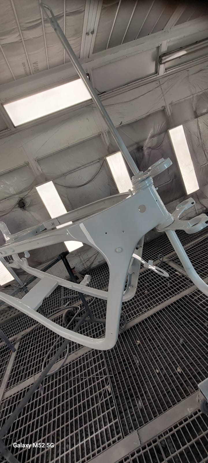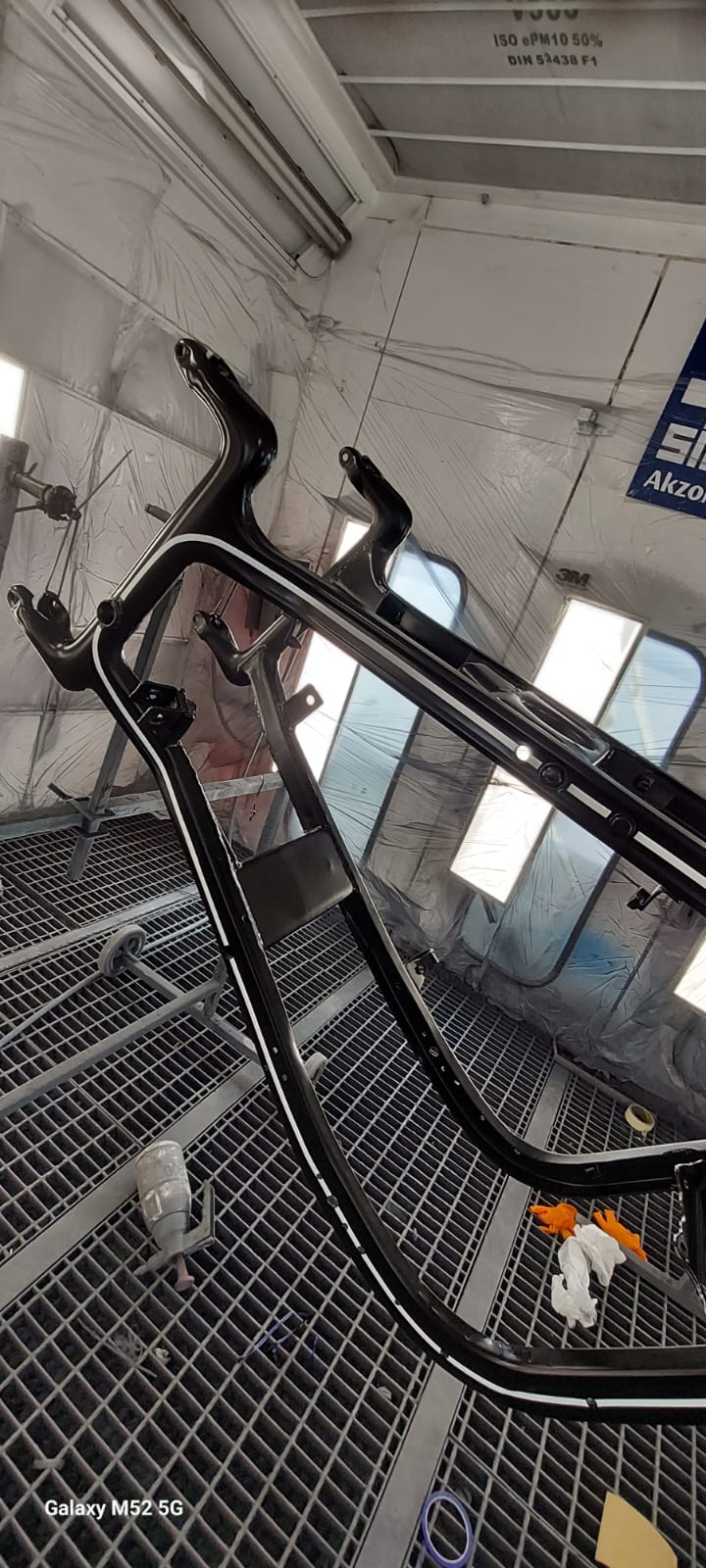 Rama po piaskowaniu ujawniła także usterkę przy uchu amortyzatora. Wszystkie pęknięcia naprawiono metodą TIG, a następnie całą ramę sprawdzono i wyprostowano na ramie kontrolnej, aby zachować fabryczną geometrię.
