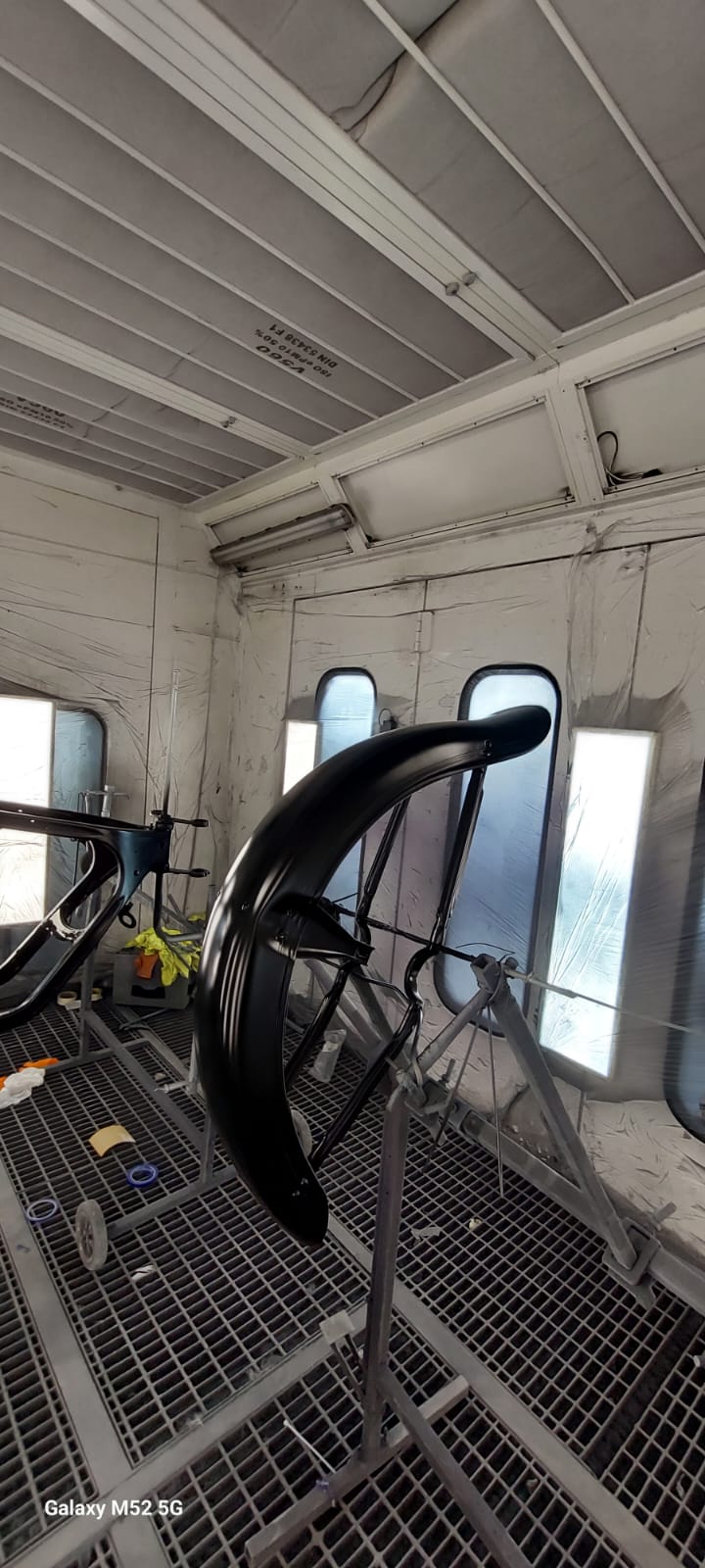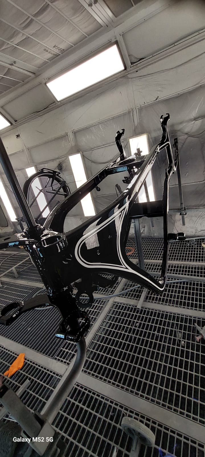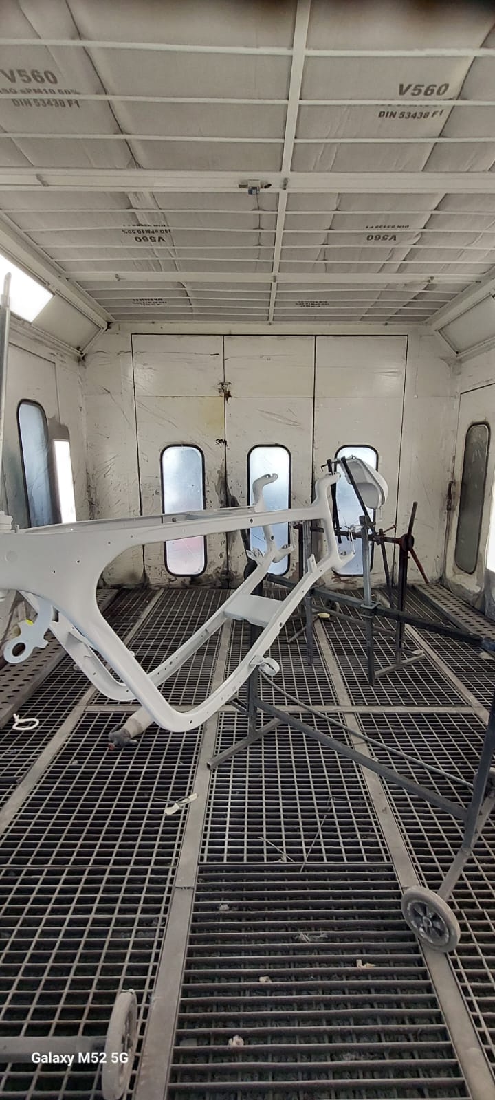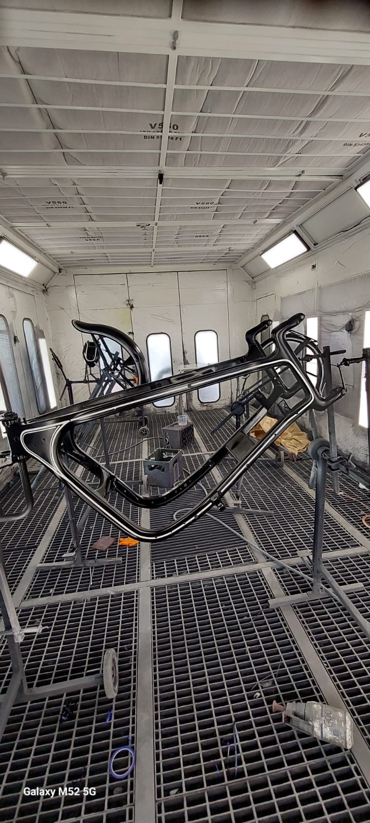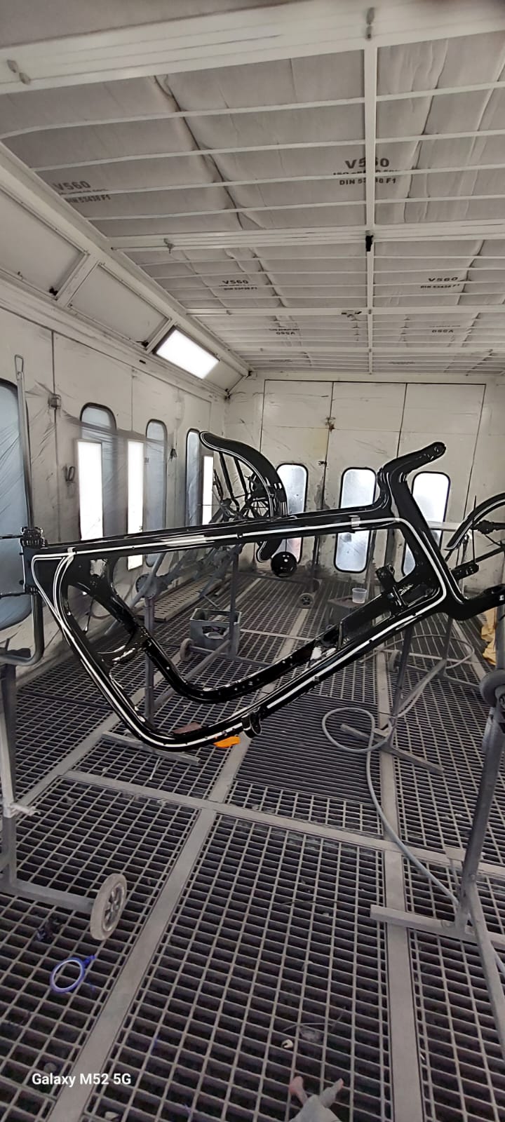 Rama po piaskowaniu ujawniła także usterkę przy uchu amortyzatora. Wszystkie pęknięcia naprawiono metodą TIG, a następnie całą ramę sprawdzono i wyprostowano na ramie kontrolnej, aby zachować fabryczną geometrię.