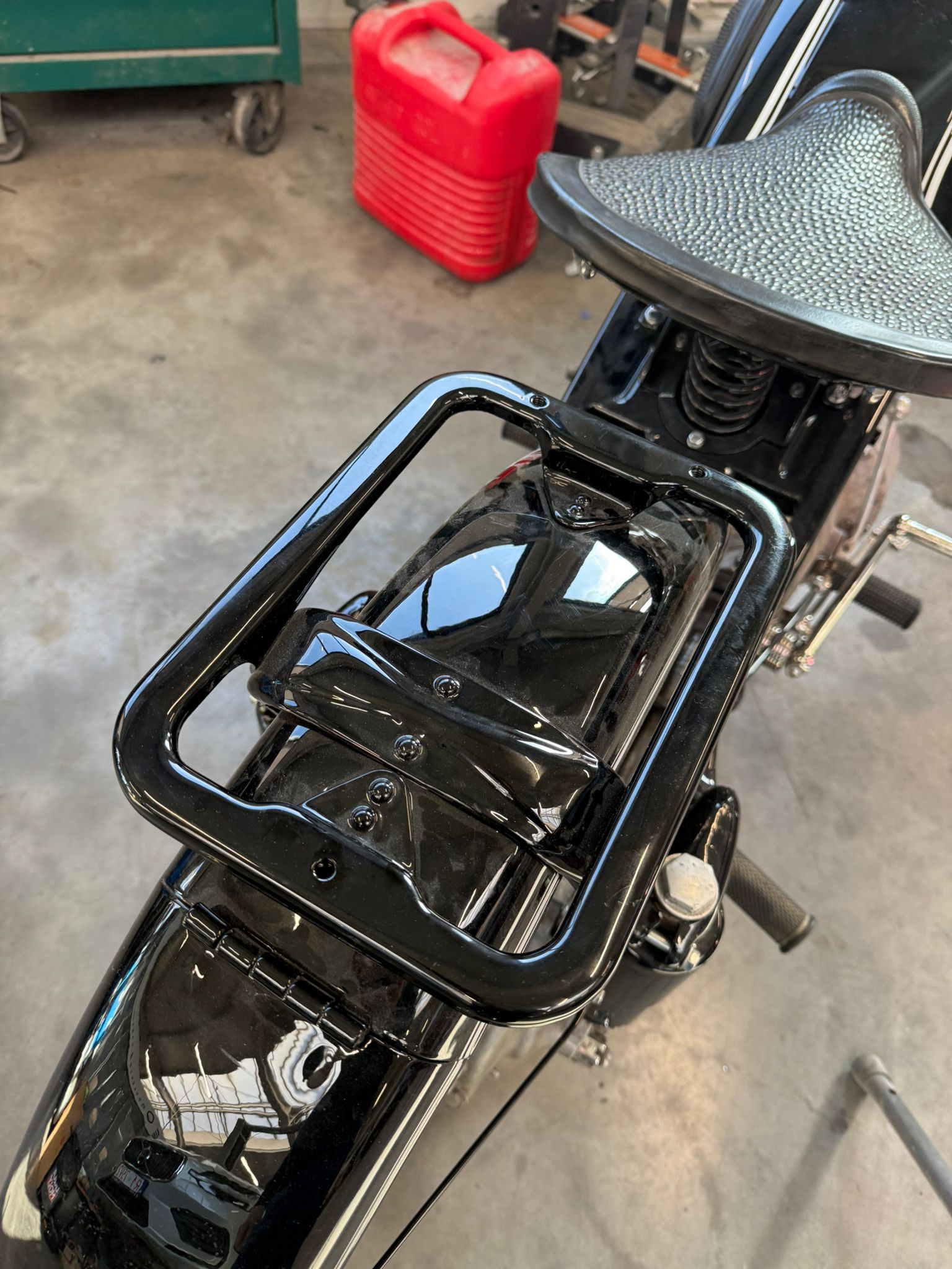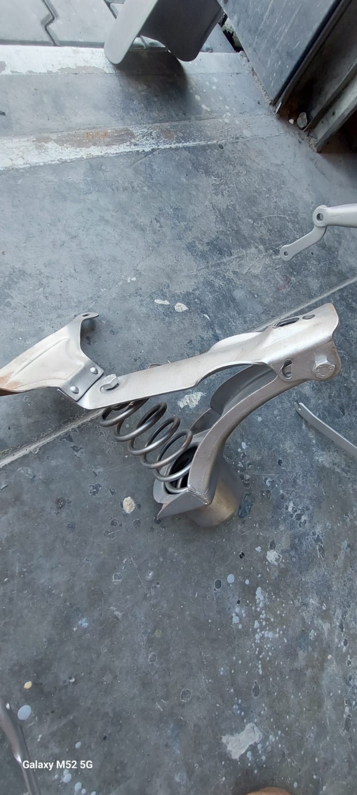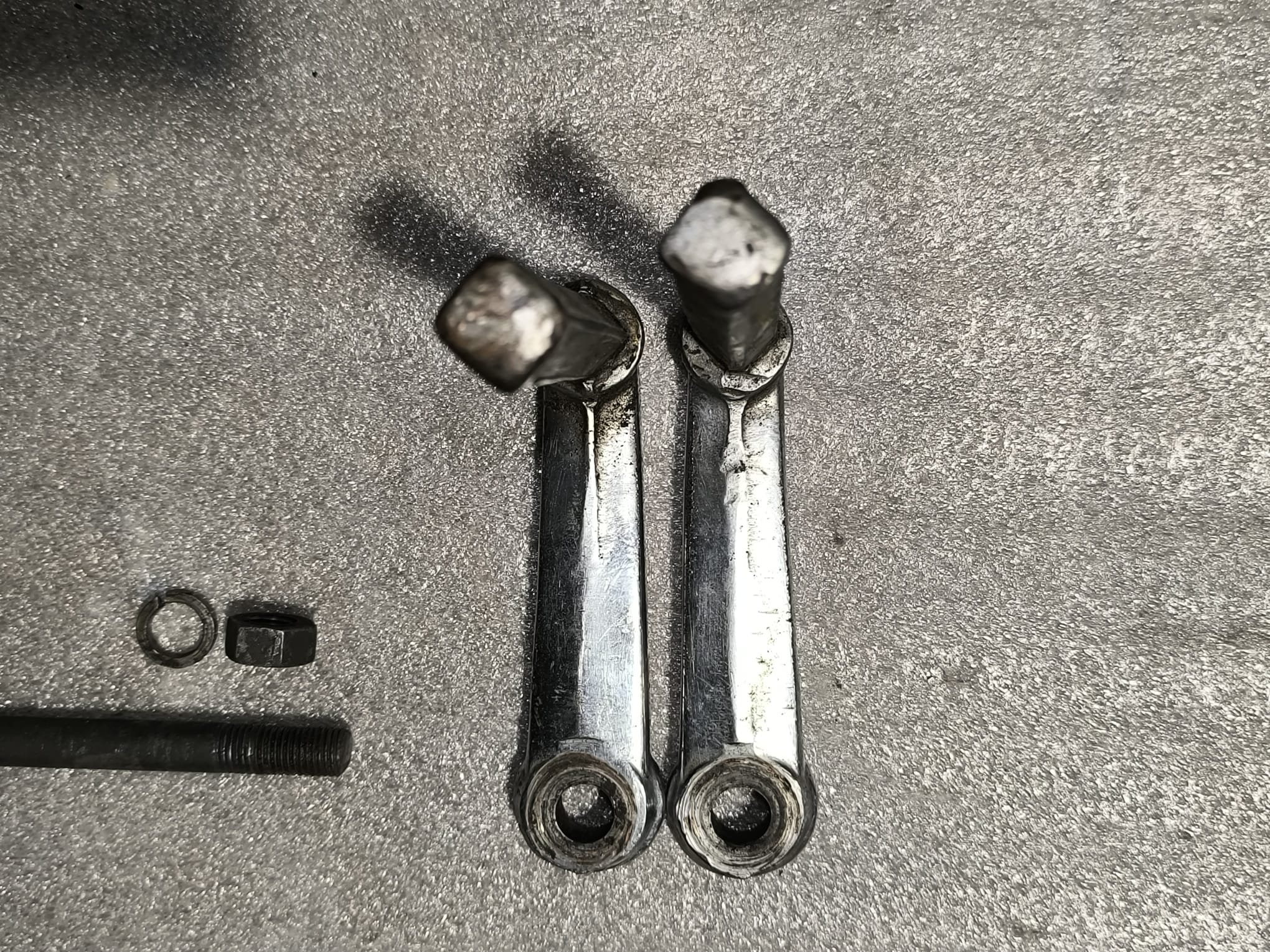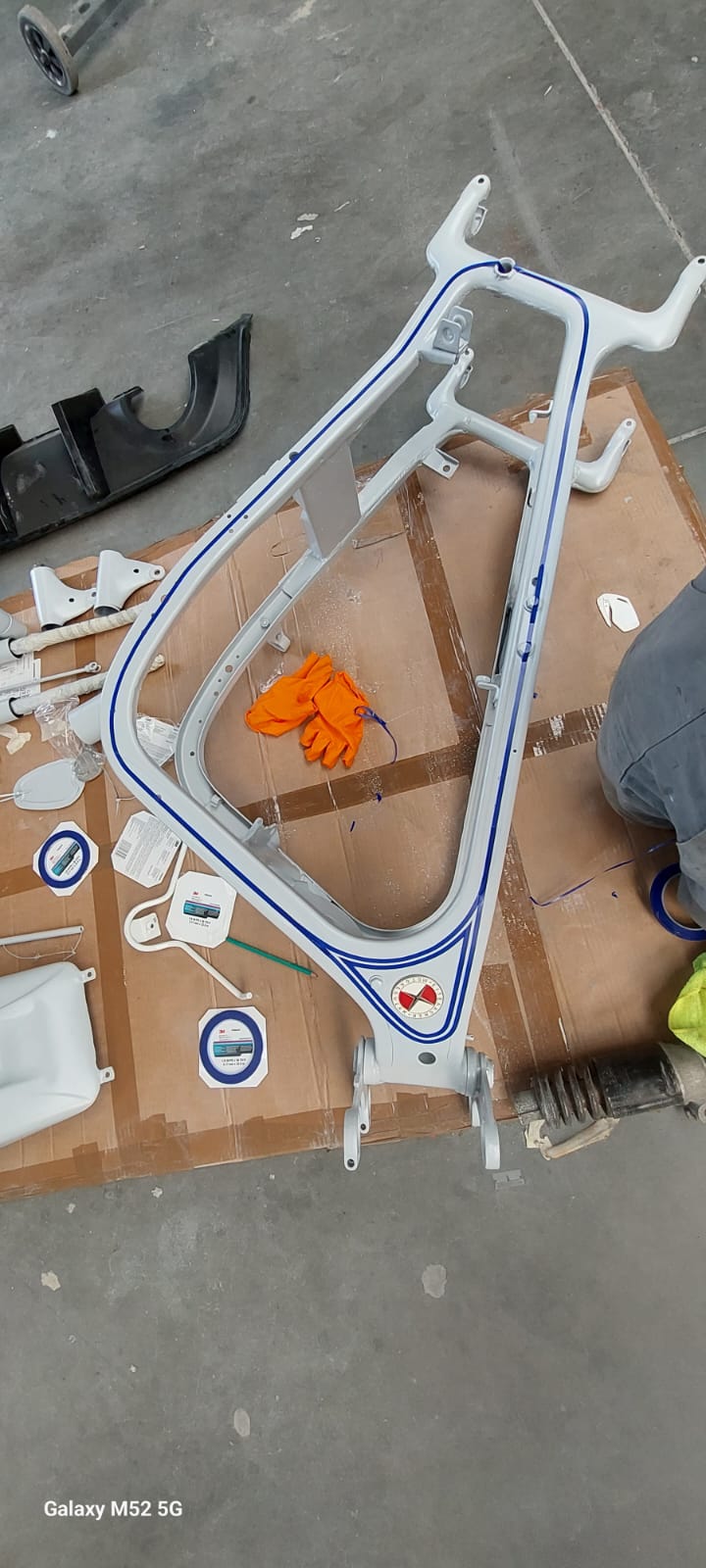 Rama po piaskowaniu ujawniła także usterkę przy uchu amortyzatora. Wszystkie pęknięcia naprawiono metodą TIG, a następnie całą ramę sprawdzono i wyprostowano na ramie kontrolnej, aby zachować fabryczną geometrię.