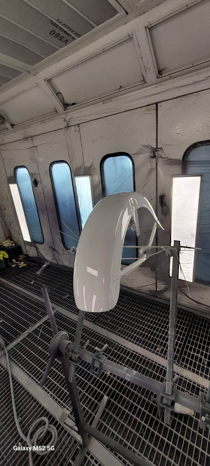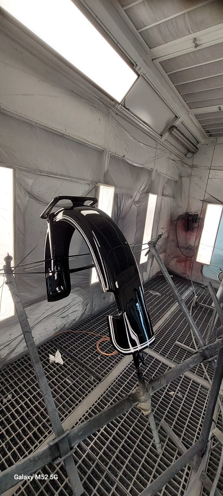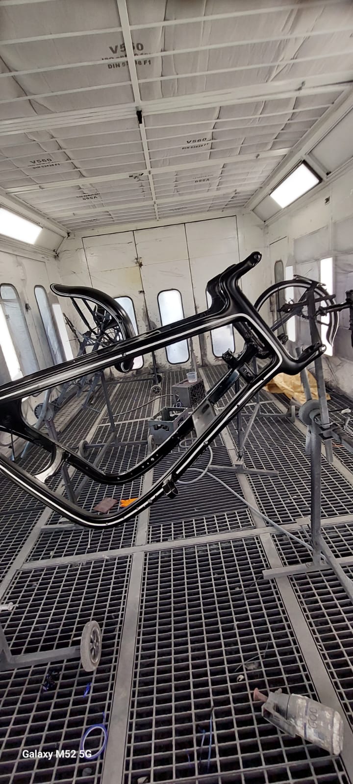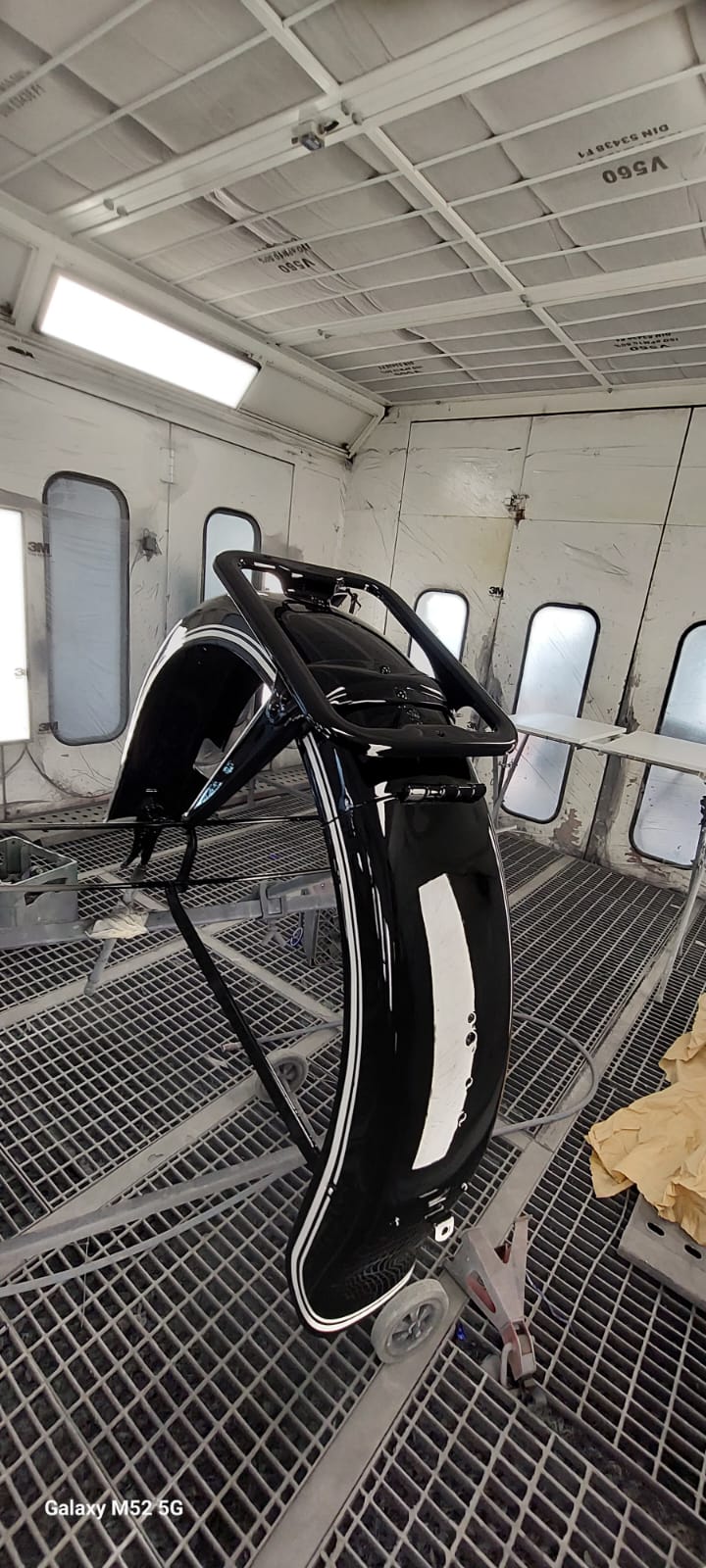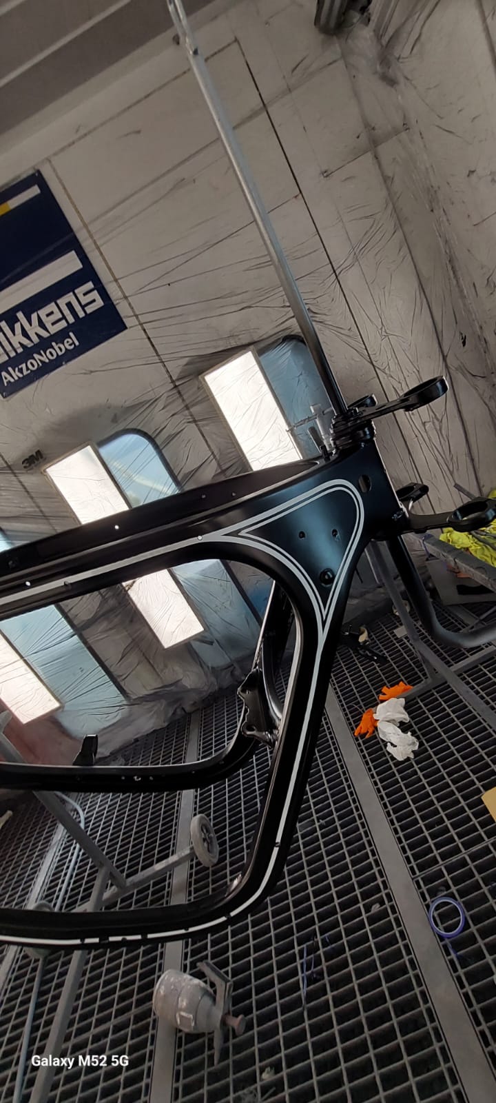 – Zostało to wypodkładowane, zabezpieczone epoksydem. Później mieliśmy pierwszą warstwę białego lakieru. Był biały podkład, ale też biała baza, która pełniła rolę podkładu kryjącego. Później okleiliśmy dwa paski, całość została pomalowana czarnym lakierem [w odcieniu Jet Black]. Po zdjęciu tych dwóch pasków zostały dwa białe ślady, i na końcu całość zalaliśmy grubszą warstwą lakieru bezbarwnego, żeby zniwelować różnice między kolorami i żeby to tworzyło jednolitą taflę i żeby było gładkie – opowiada.