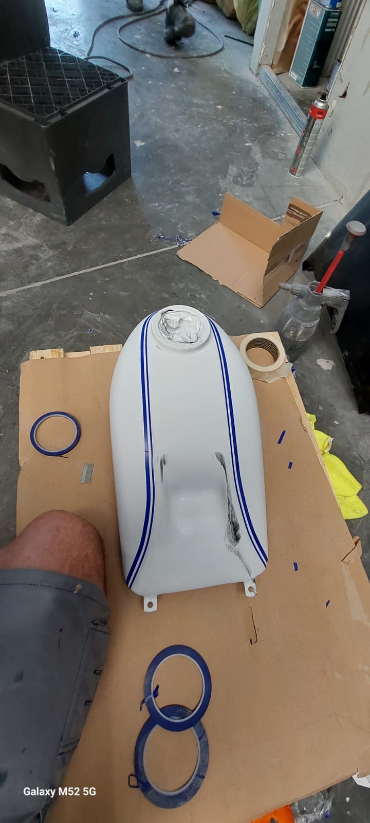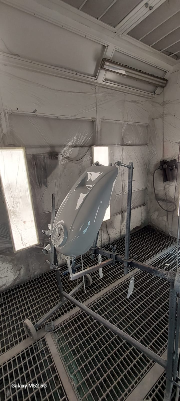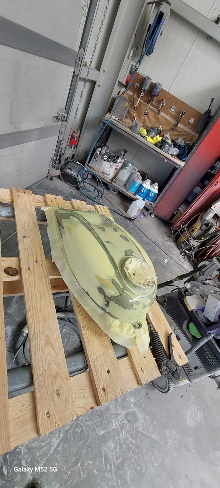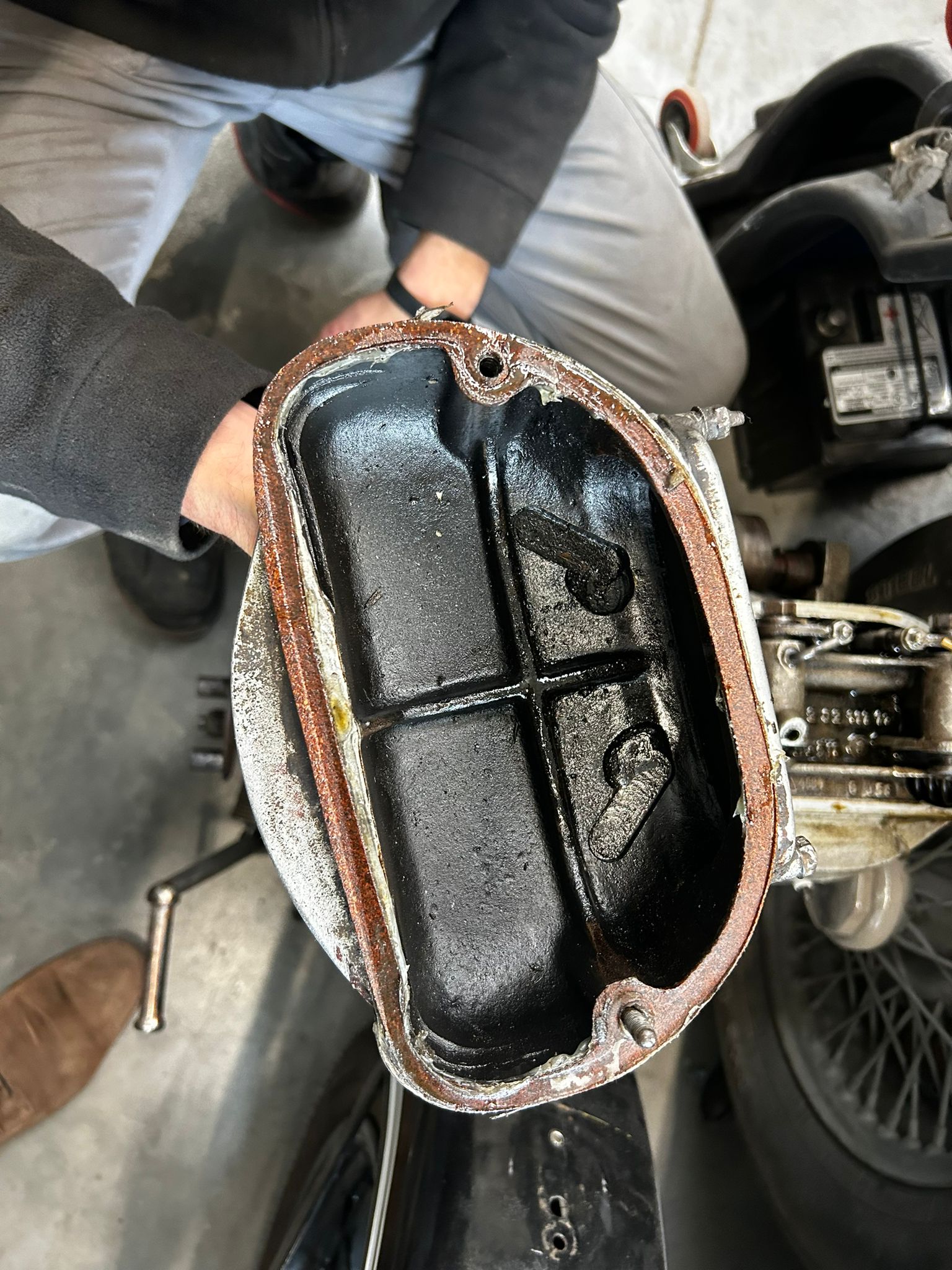 Konieczne było rozcięcie zbiornika. Jak opisuje przedstawiciel CUNEO, wnętrze oczyszczono chemicznie i metodą śrutowania szkłem. Deformacje po uderzeniach naprawiono klasycznie – wypychaniem i cynowaniem, by uniknąć nadmiaru szpachli. Po spawaniu bak został wytrawiony kwasem fosforowym, zabezpieczony epoksydem, a do wnętrza wlano specjalny preparat uszczelniający na bazie żywic fenolowych.